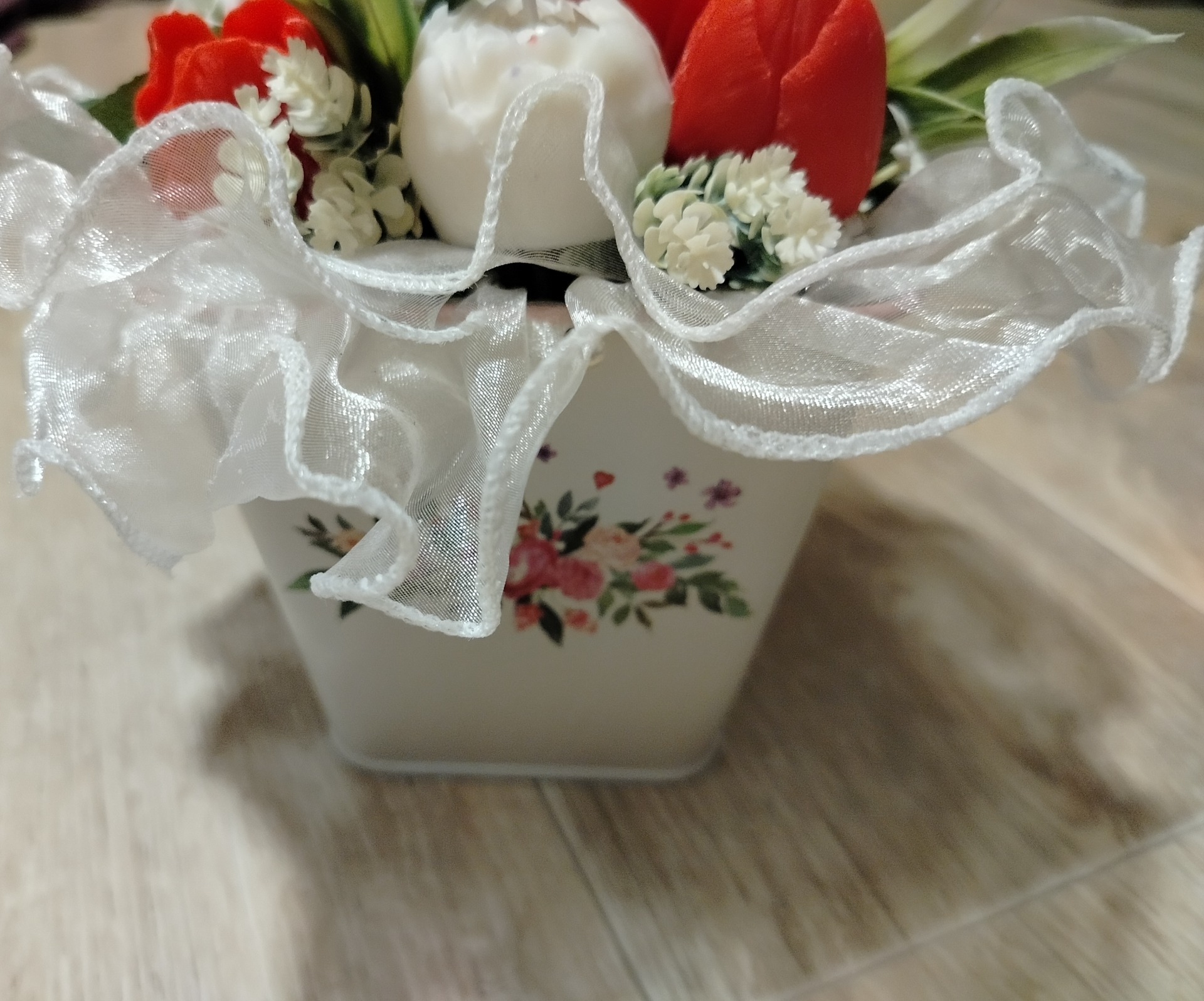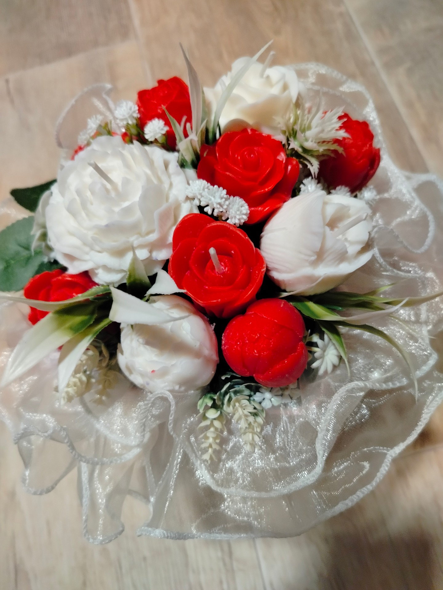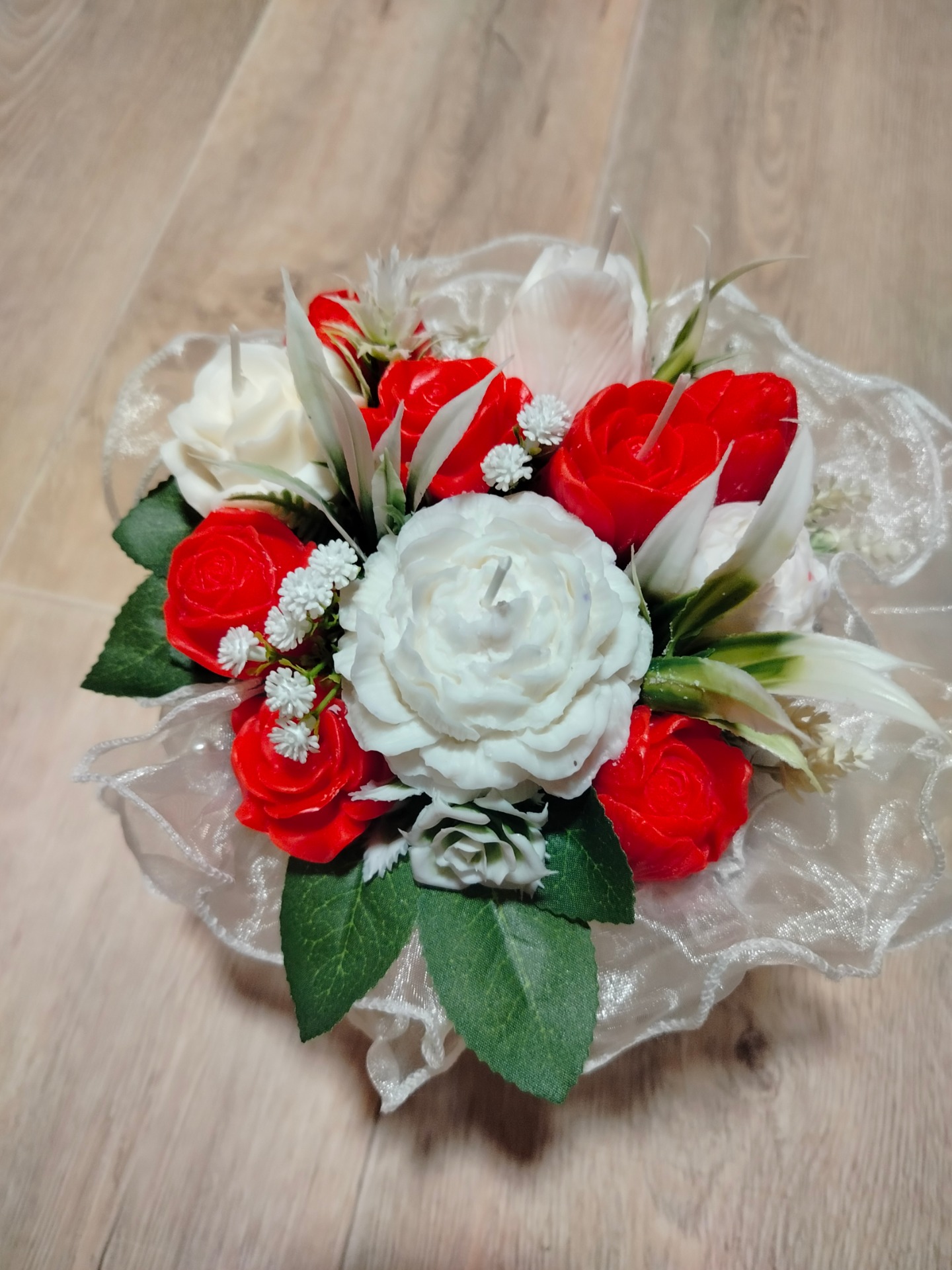 Upozornění: Pokud se rozhodnete zapálit květ s knotem, vždy jej nejprve vyjměte z kytice, položte na nehořlavou podložku (talířek, tácek...) a pak teprve je možné svíčku zapálit. Okolní materiál je hořlavý. Kytice je určena spíše k dekoraci.