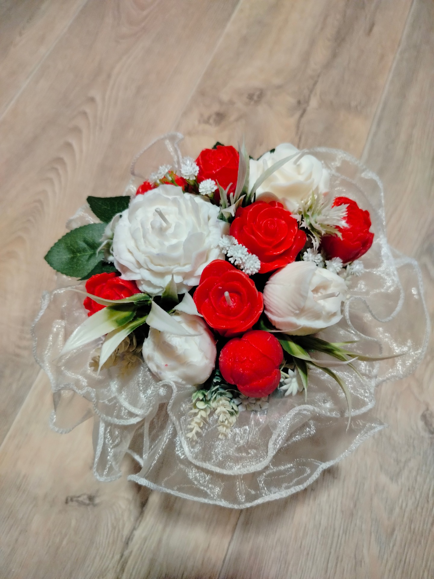 Kytice s květy ze sójového vosku se svíčkami. Doplněná umělými kvítky.