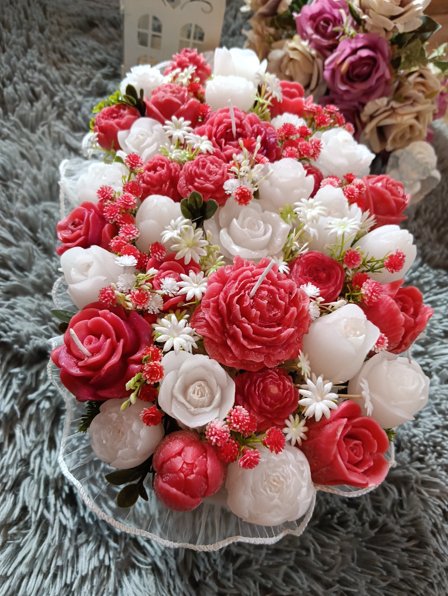 Kytice s květy ze sójového vosku se svíčkami. Doplněná umělými kvítky.
