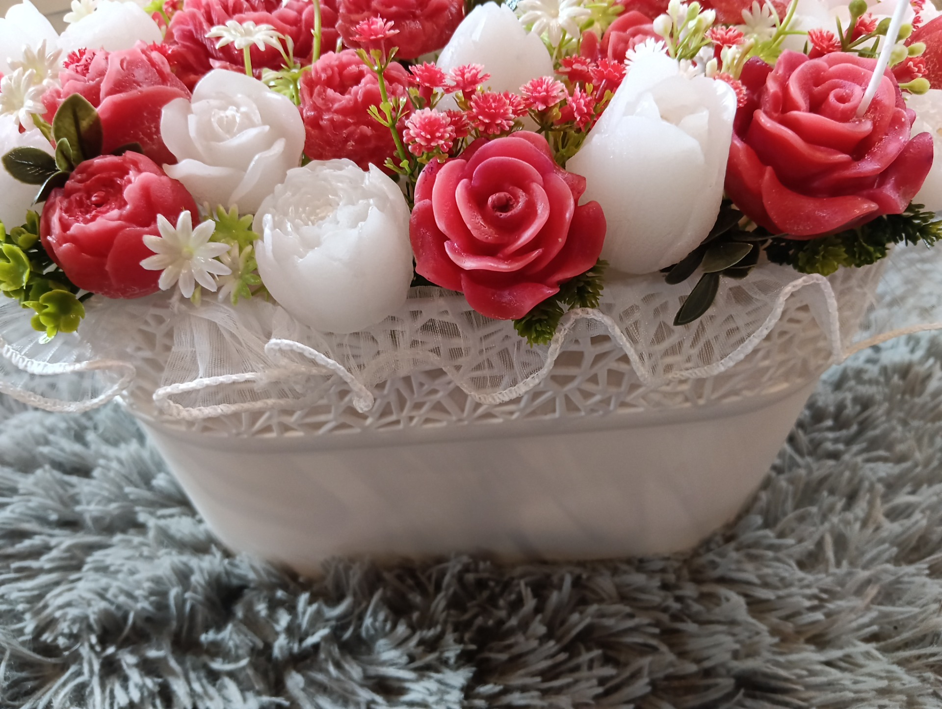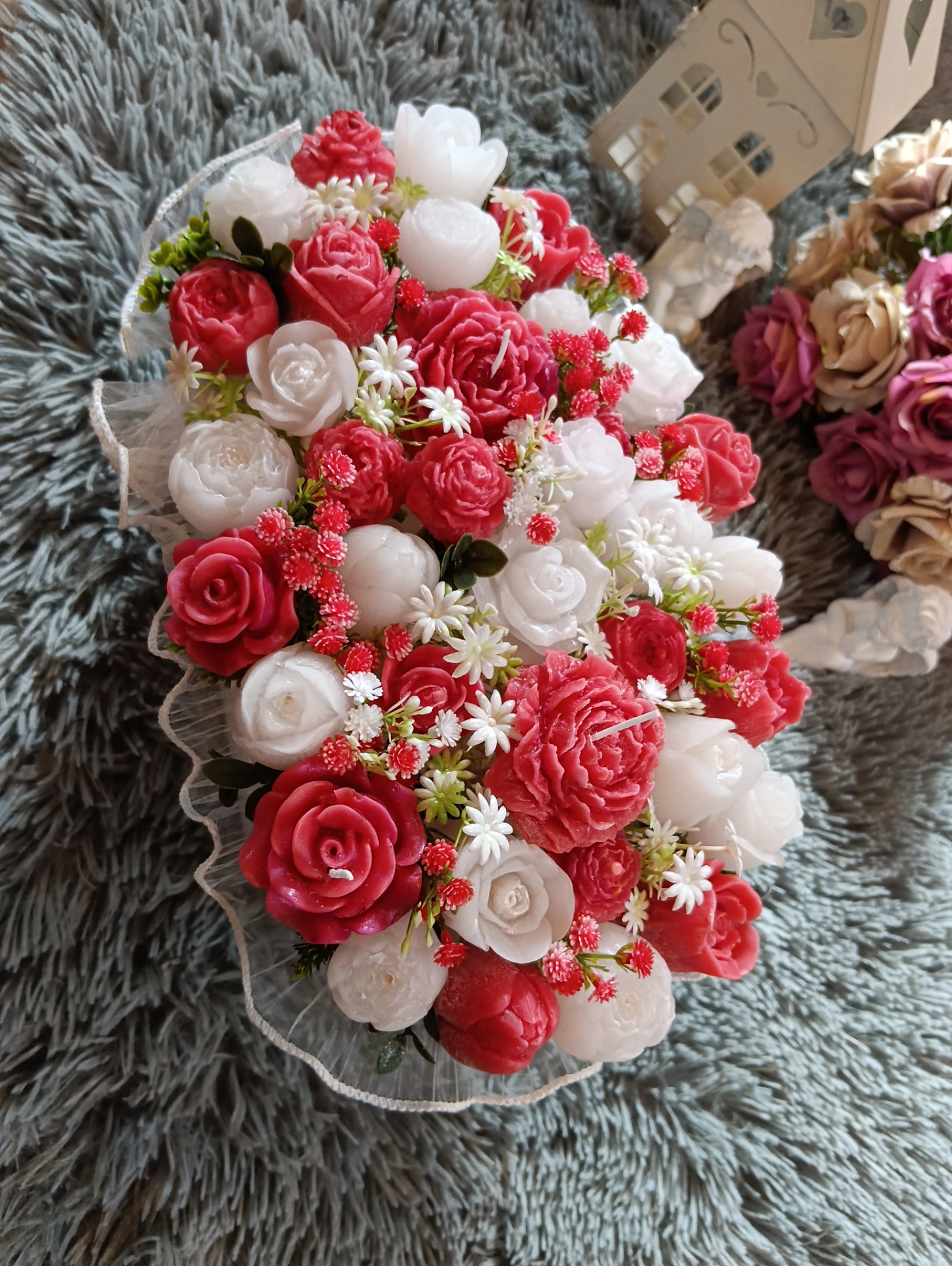 Upozornění: Pokud se rozhodnete zapálit květ s knotem, vždy jej nejprve vyjměte z kytice, položte na nehořlavou podložku (talířek, tácek...) a pak teprve je možné svíčku zapálit. Okolní materiál je hořlavý. Kytice je určena spíše k dekoraci.