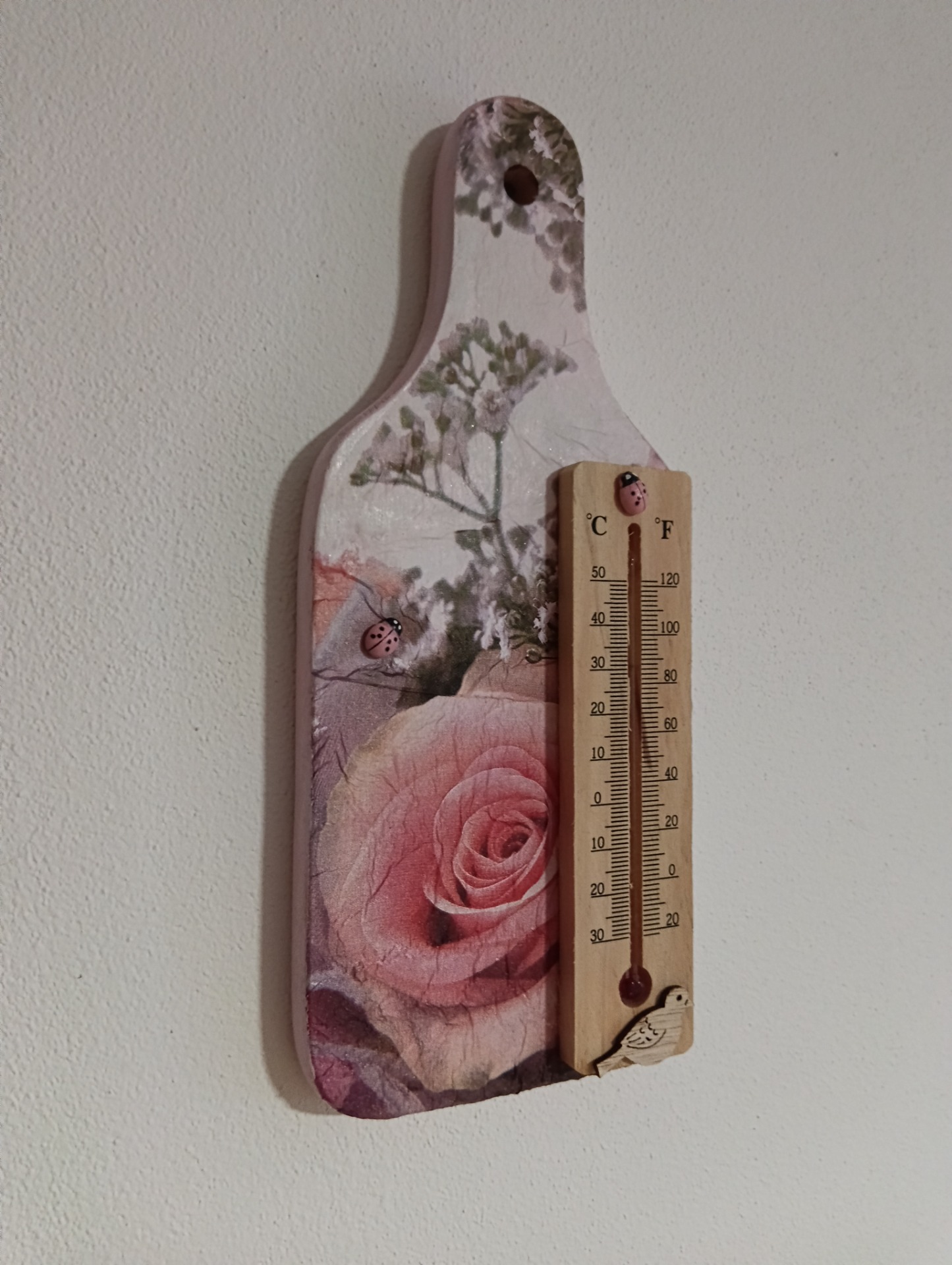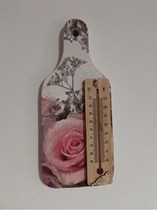 Dřevěné dekorované prkénko k zavěšení s teploměrem.Autorský výrobek z naší dílny.Praktický a krásný dárek pro Vás nebo Vaše blízké.