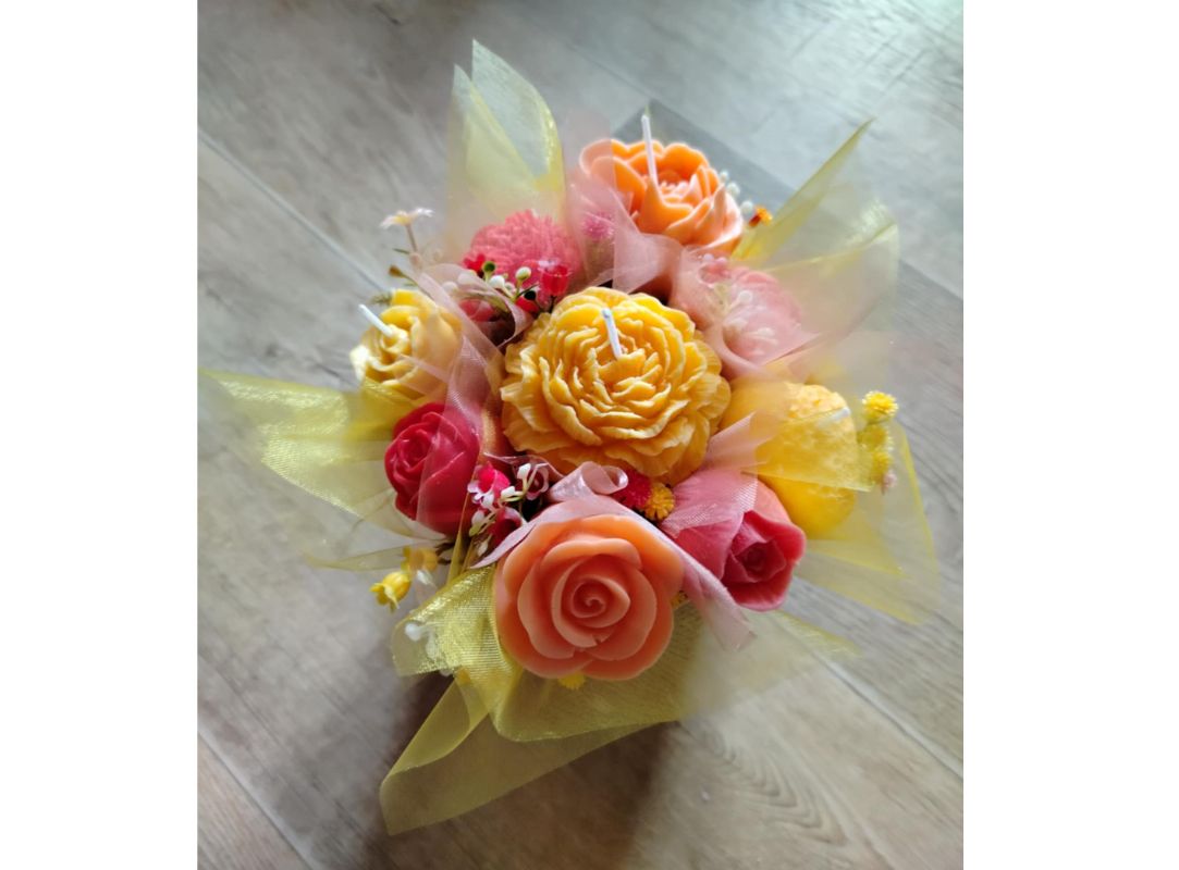 Kytice s květy ze sójového vosku se svíčkami. Doplněná umělými kvítky.