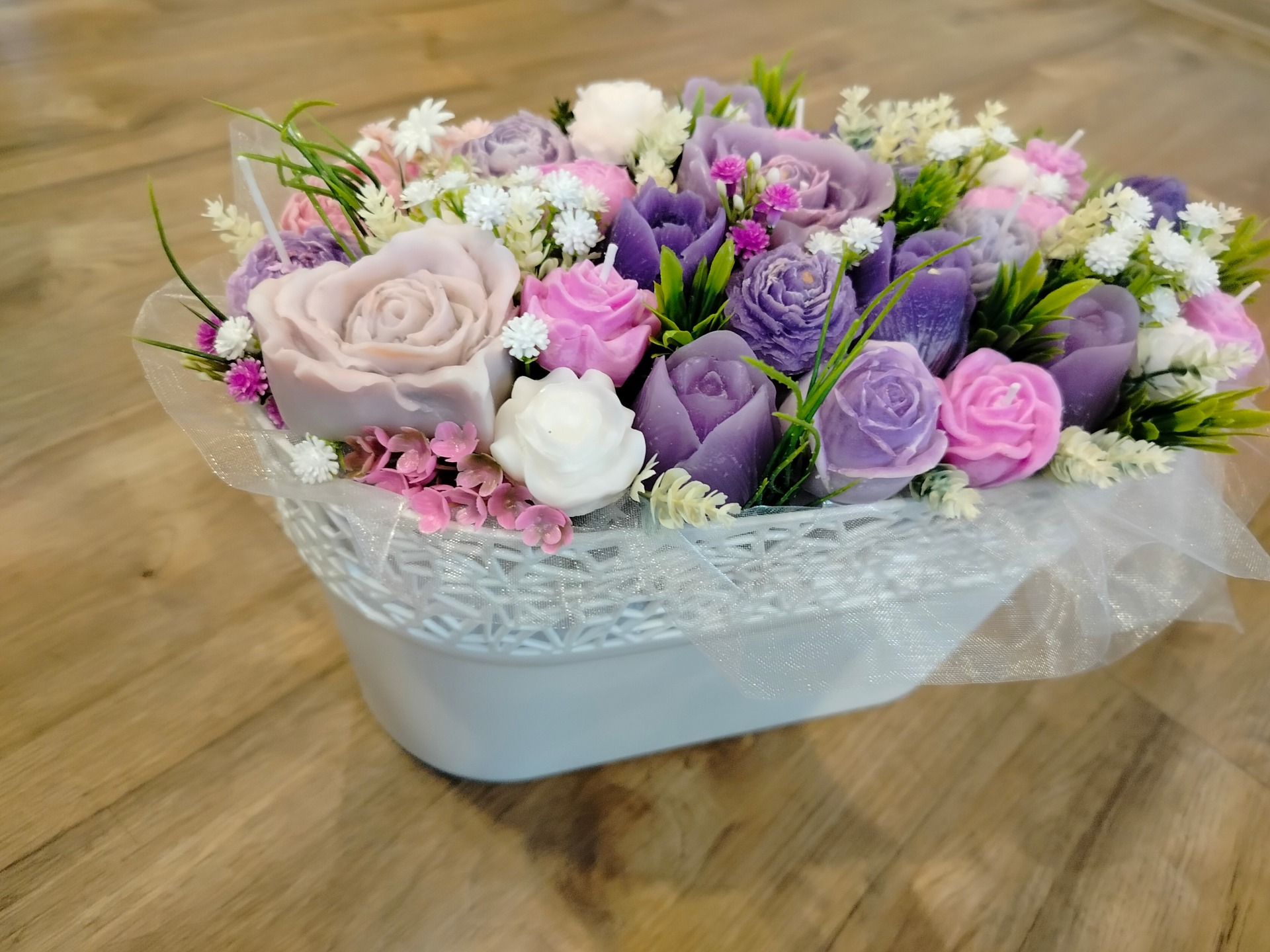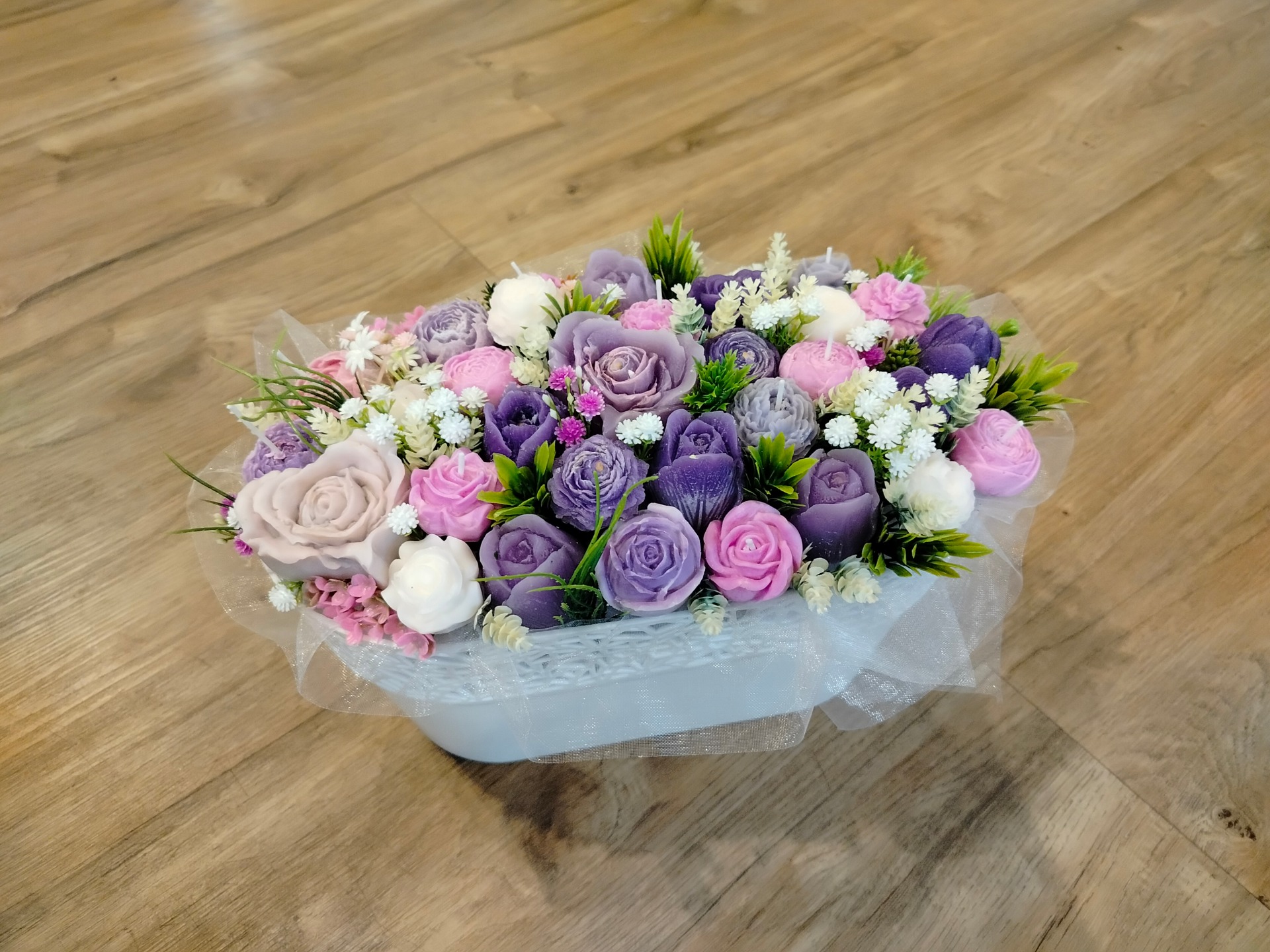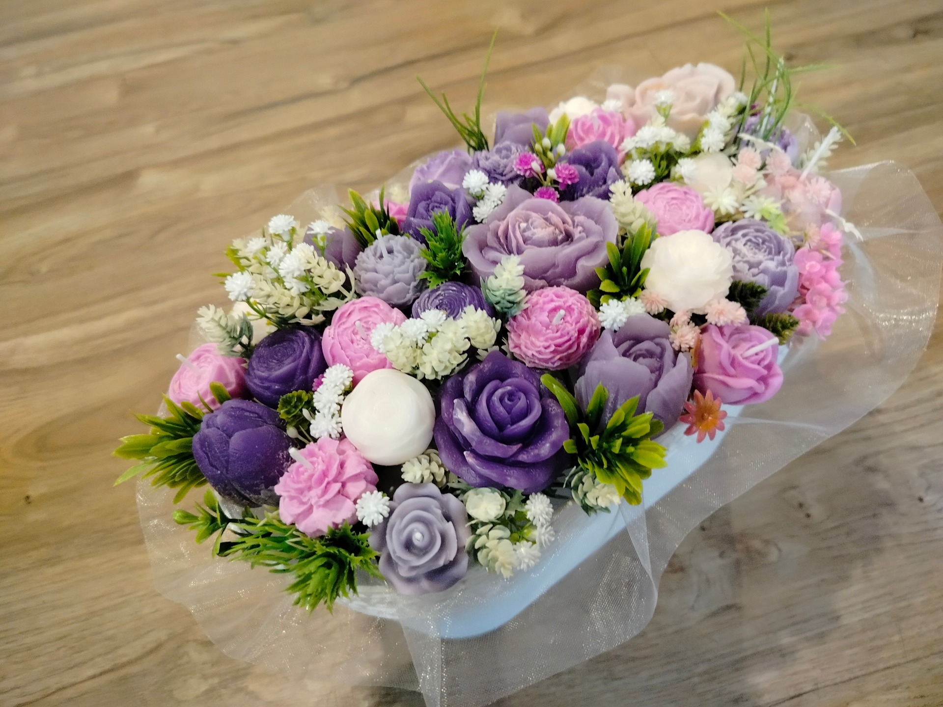 Kytice se svíčkami.Délka 30 cm, výška 20 cm, šíře 20 cm.