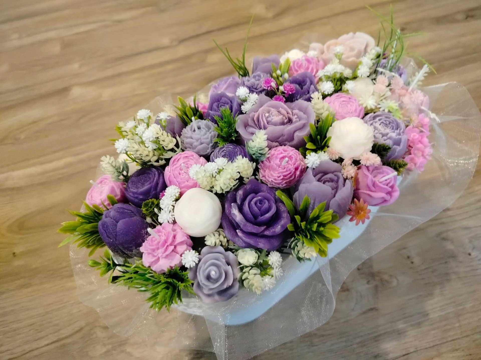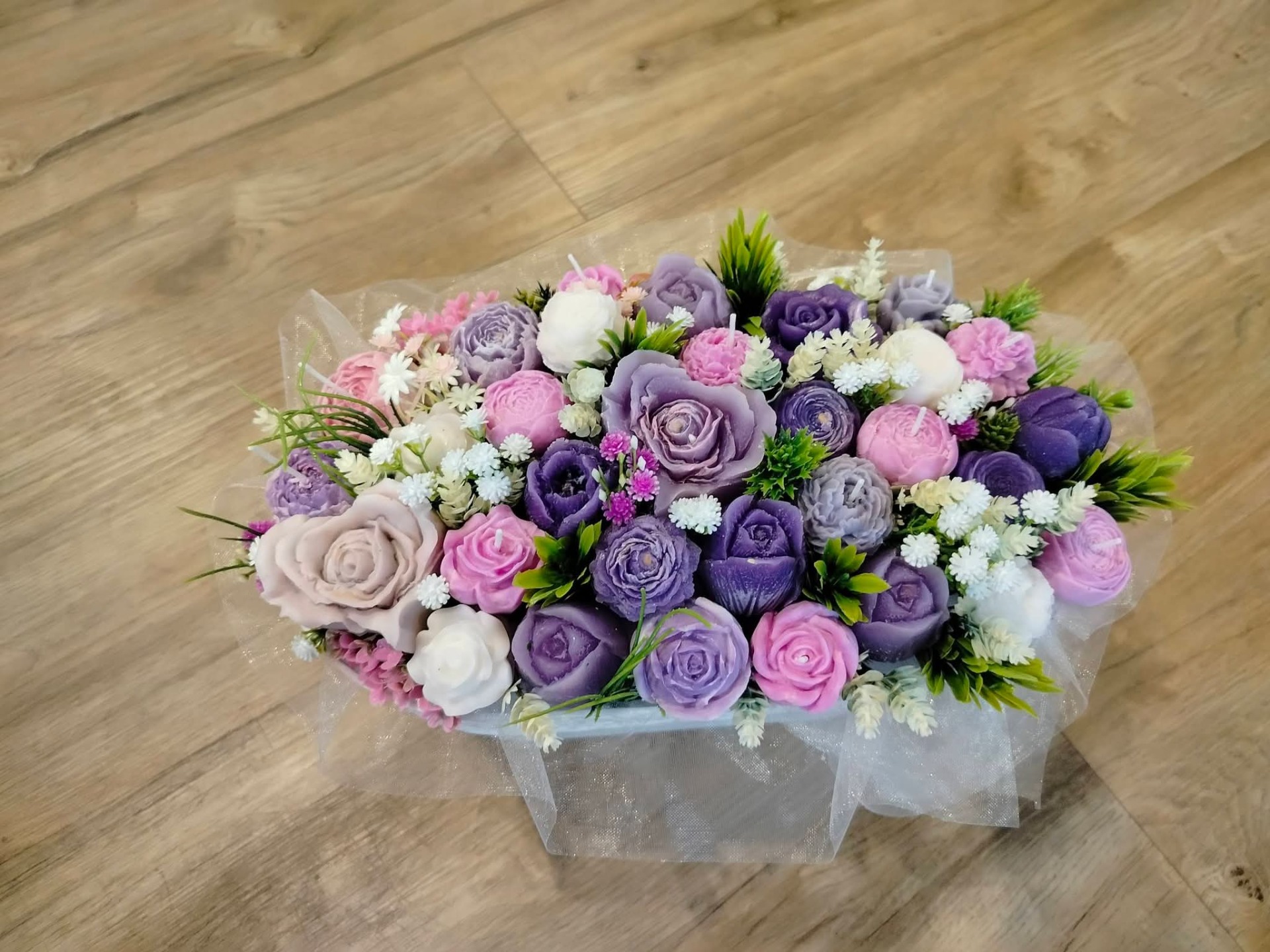Kytice s květy ze sójového vosku se svíčkami. Doplněná umělými kvítky.
