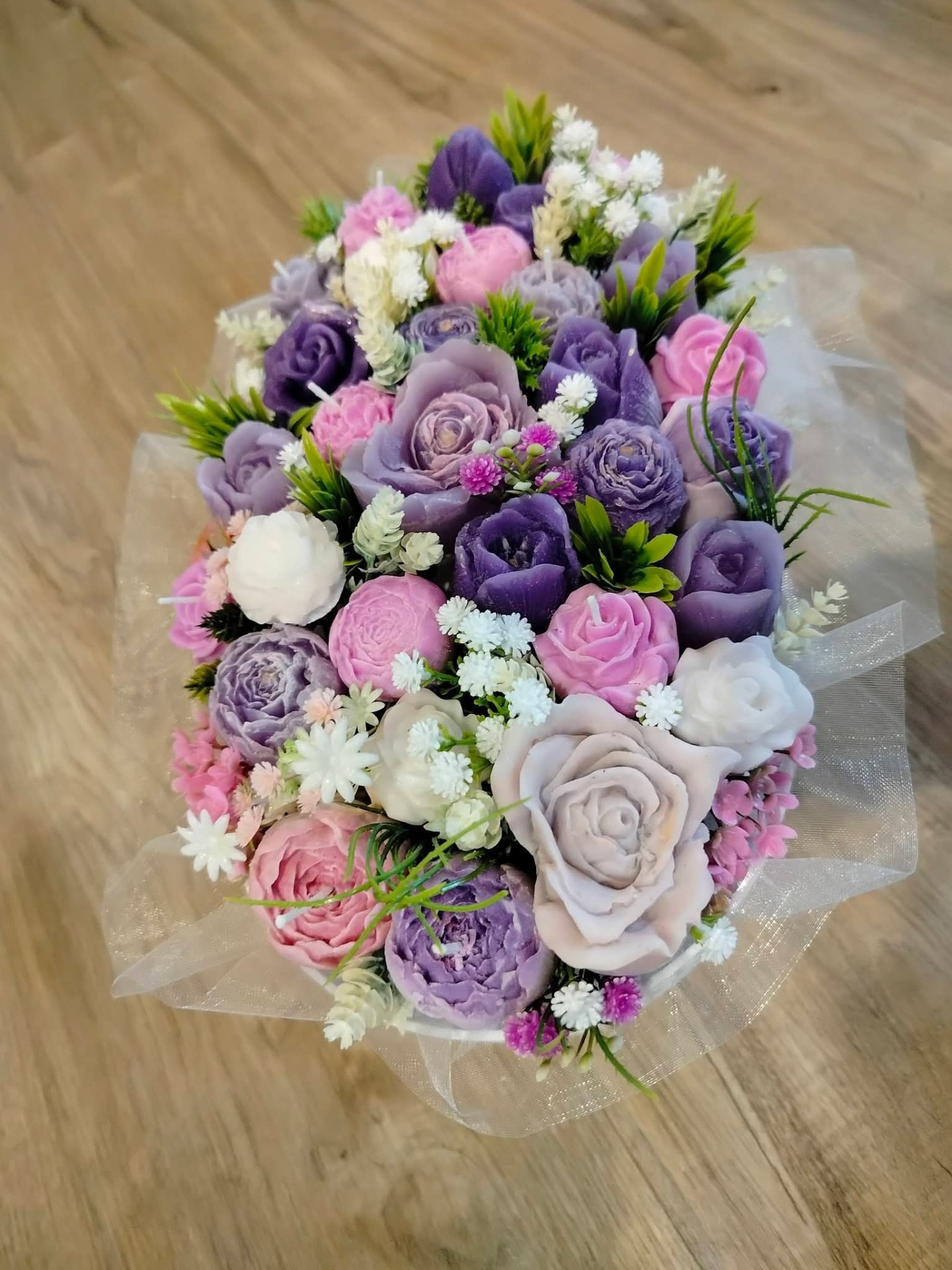 Na zakázku vyrobíme kytici i v jiných barvách. Neváhejte nás kontaktovat e-mailem, přes Facebook nebo telefonicky. Rádi vyrobíme svíčku na zakázku přesně podle Vašich představ.