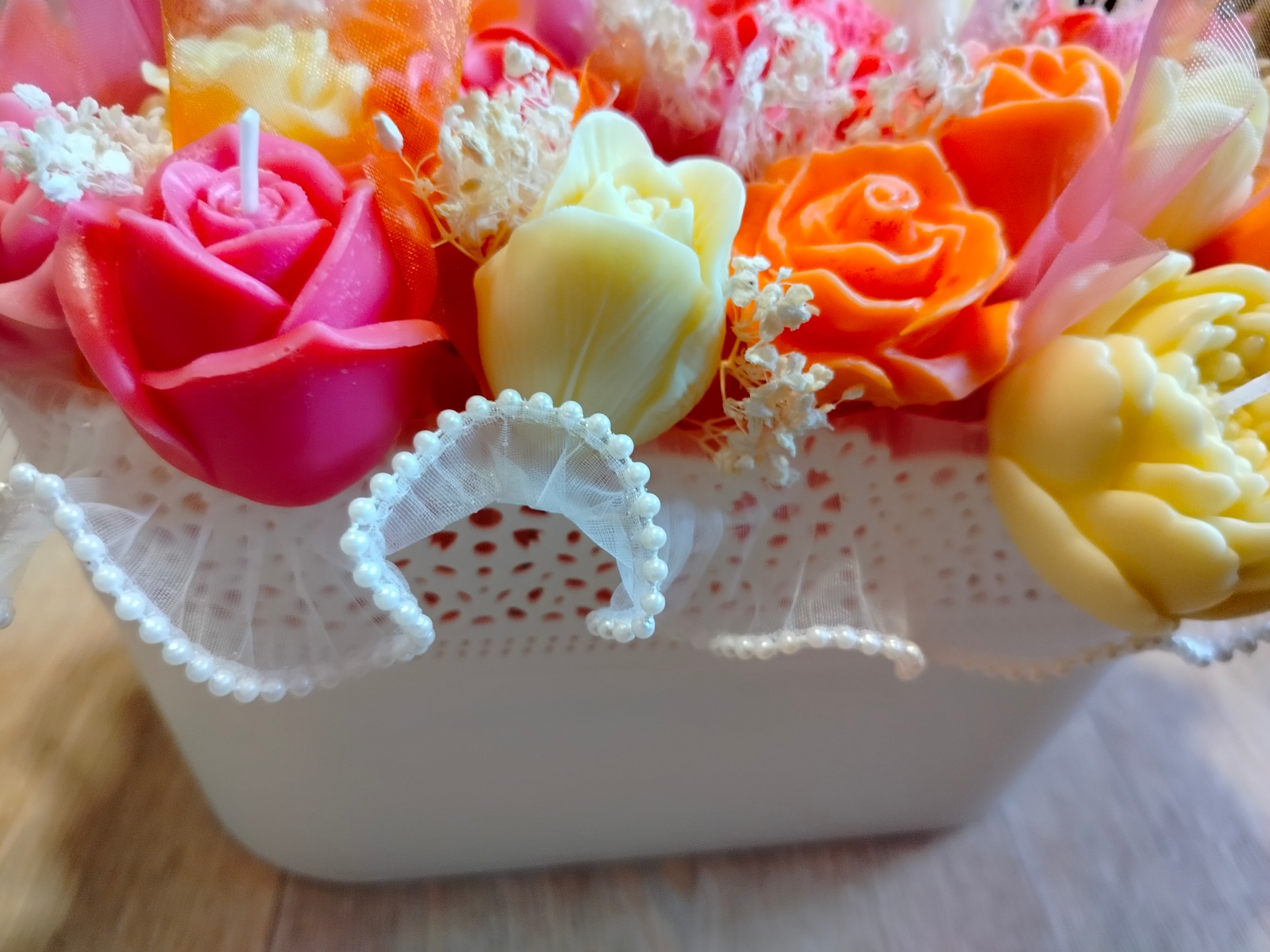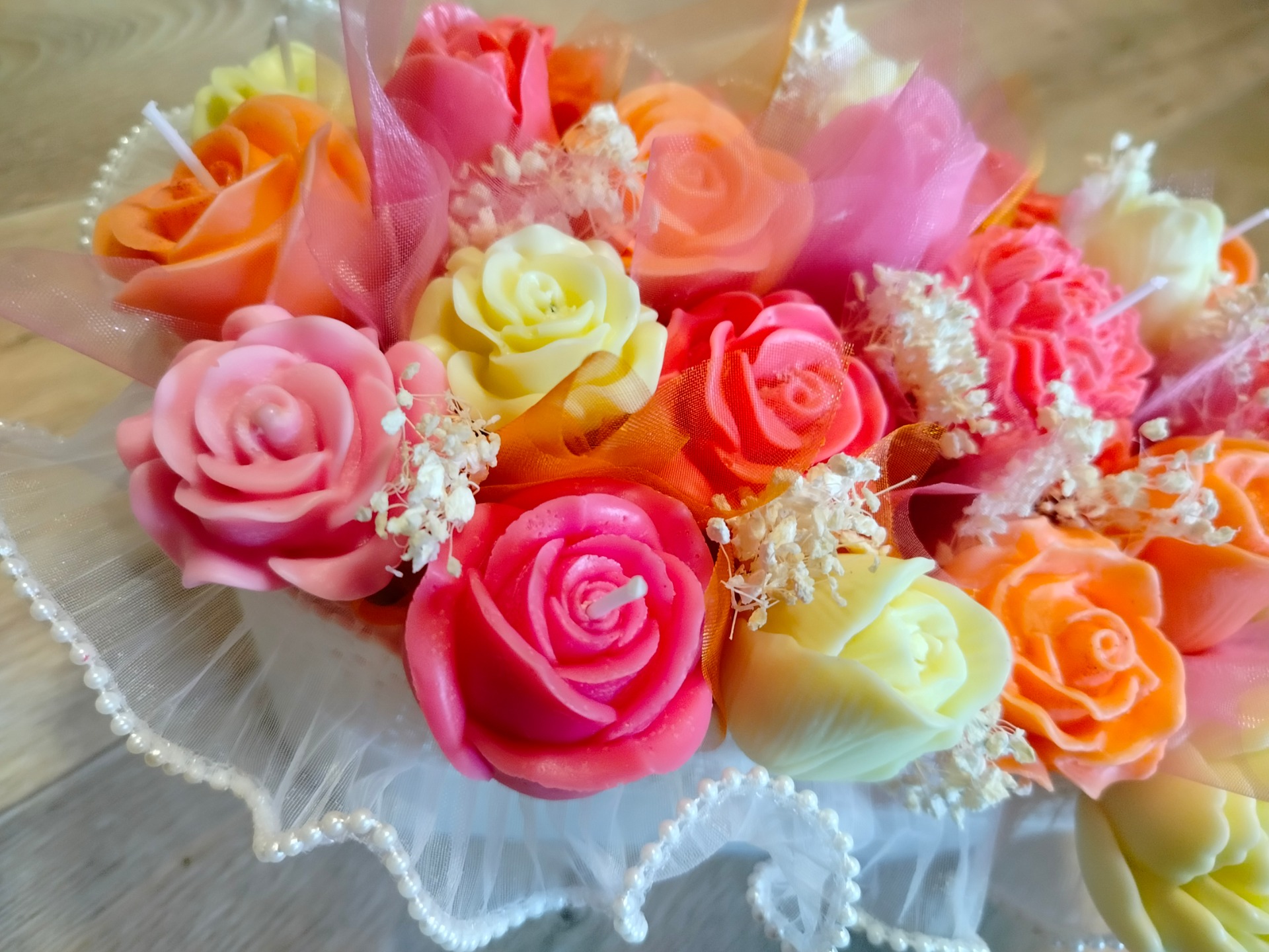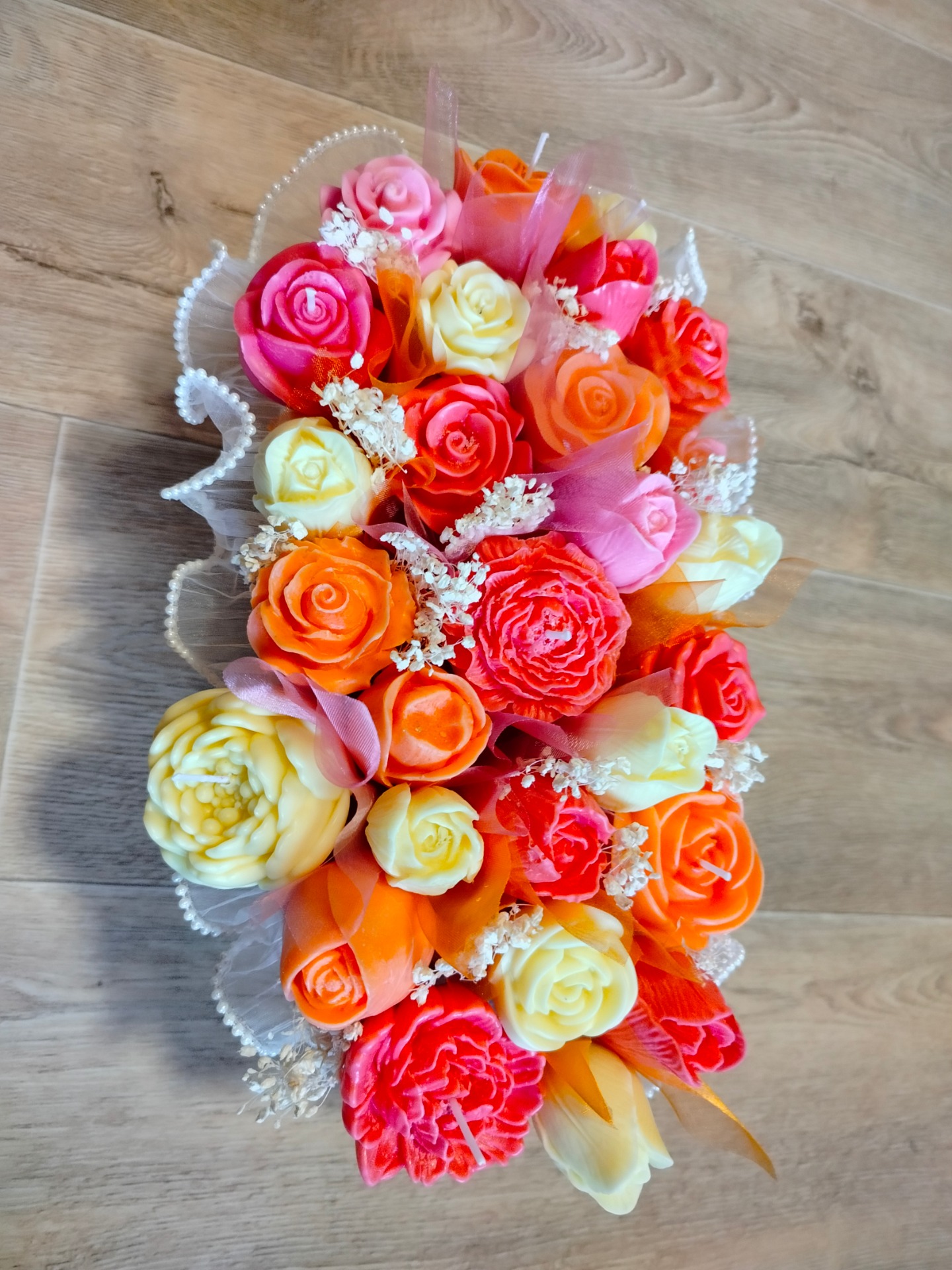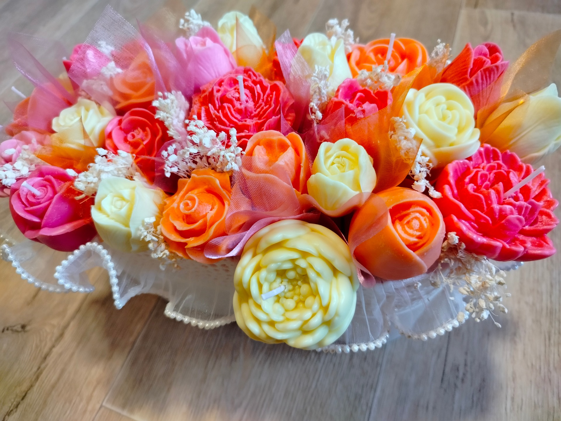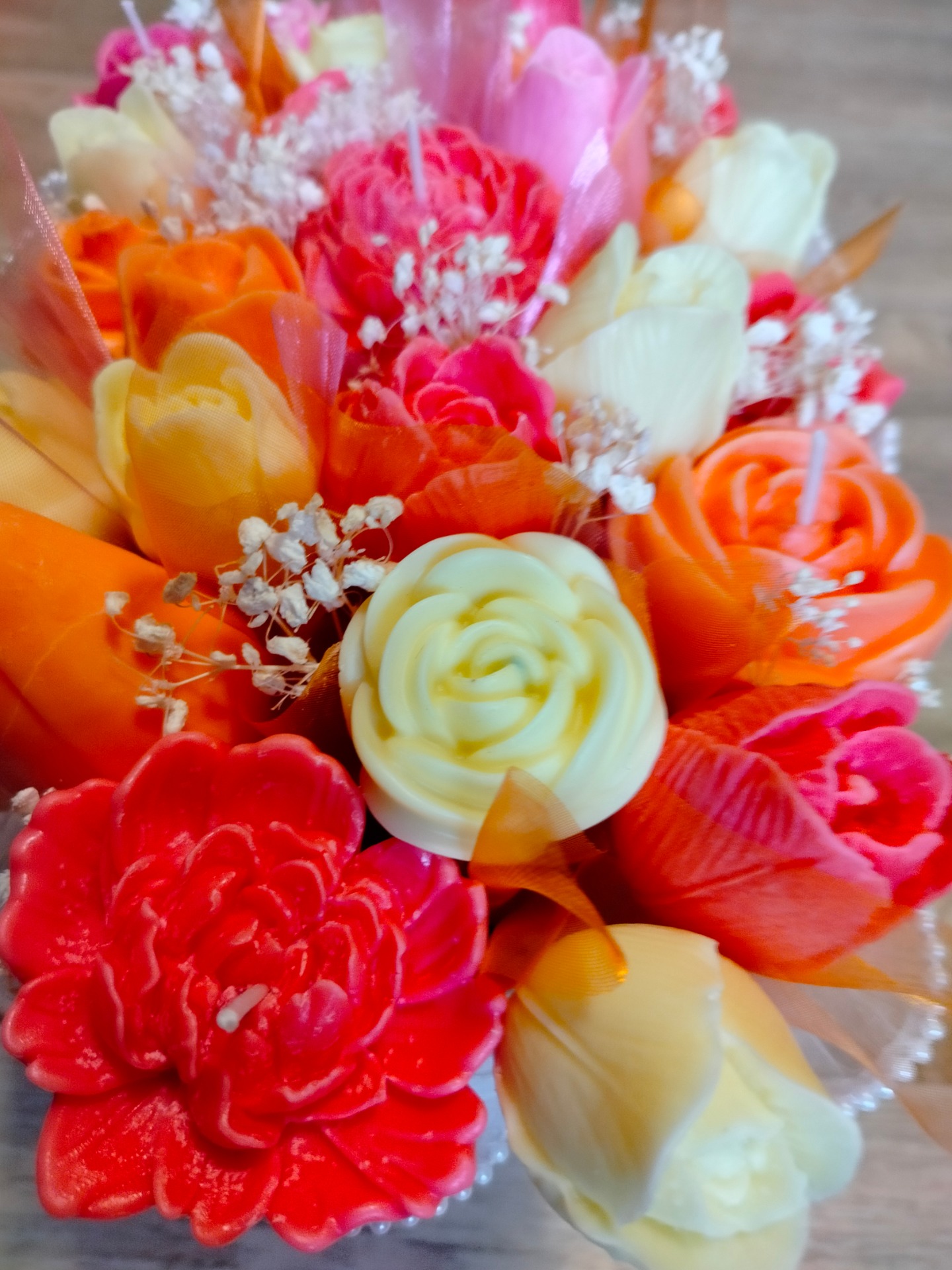 Na zakázku vyrobíme kytici i v jiných barvách. Neváhejte nás kontaktovat e-mailem, přes Facebook nebo telefonicky. Rádi vyrobíme svíčku na zakázku přesně podle Vašich představ.