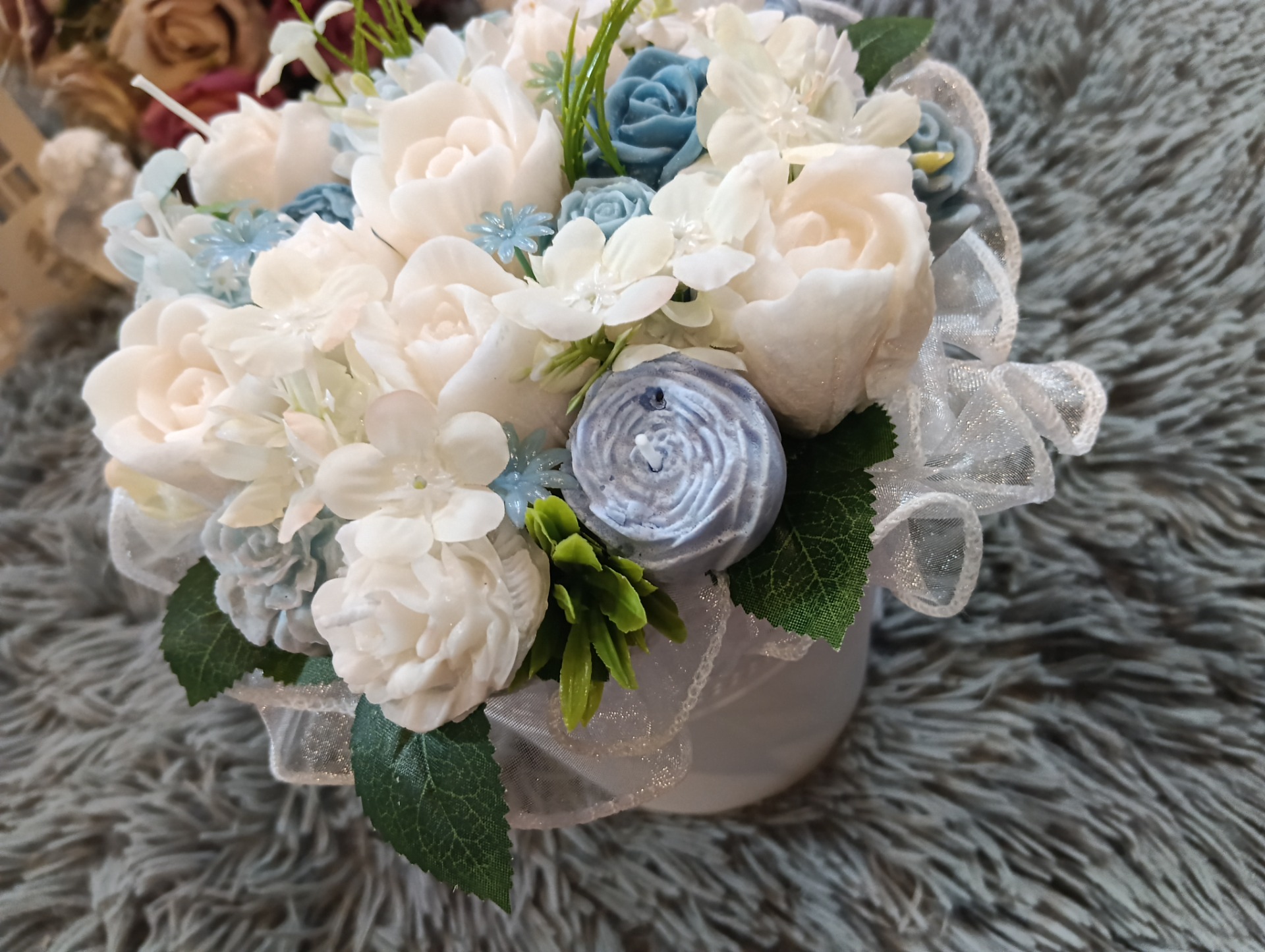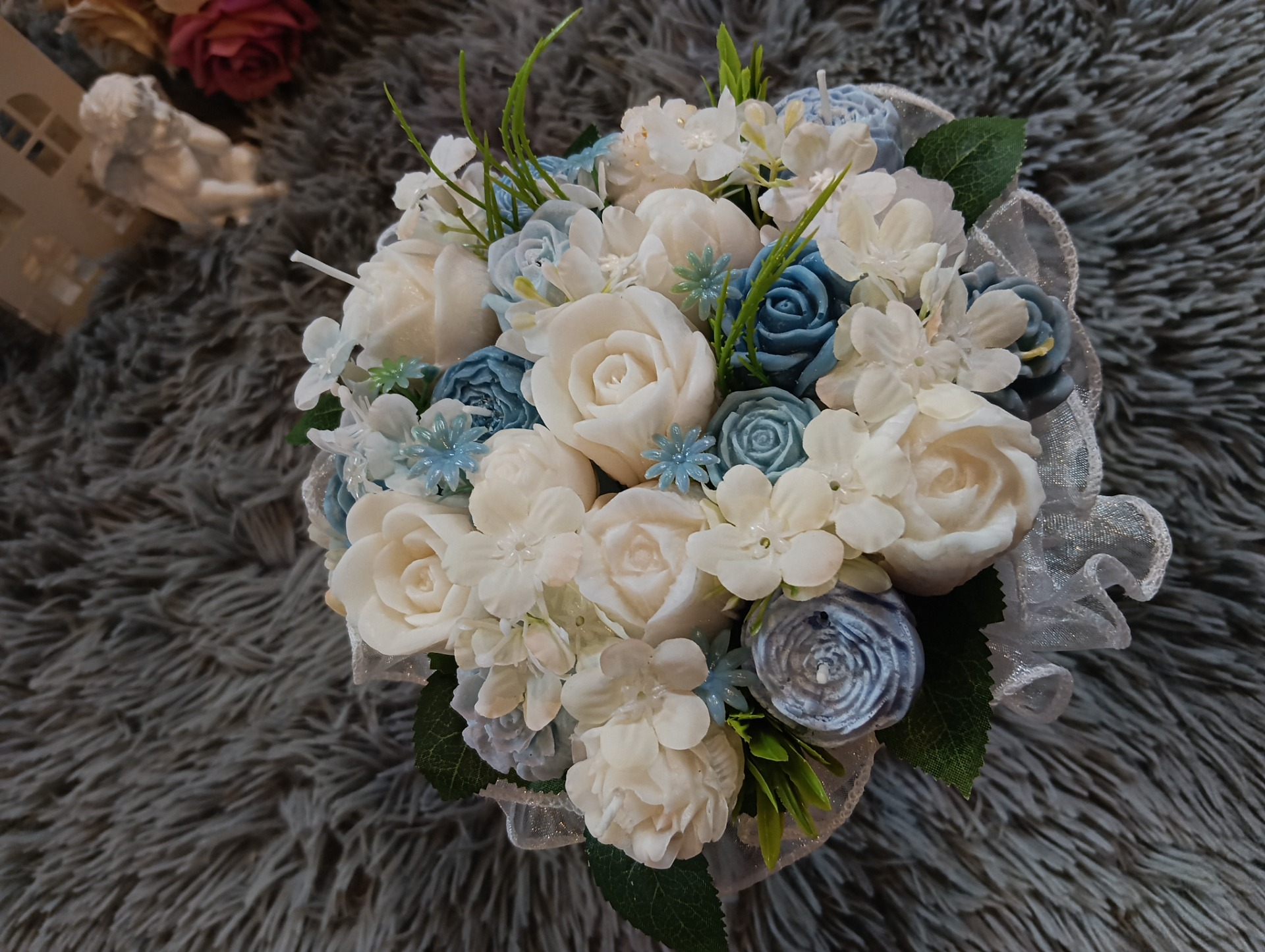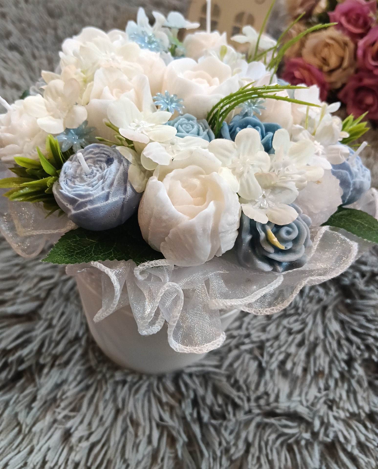 Kytice s květy ze sójového vosku se svíčkami. Doplněná umělými kvítky.