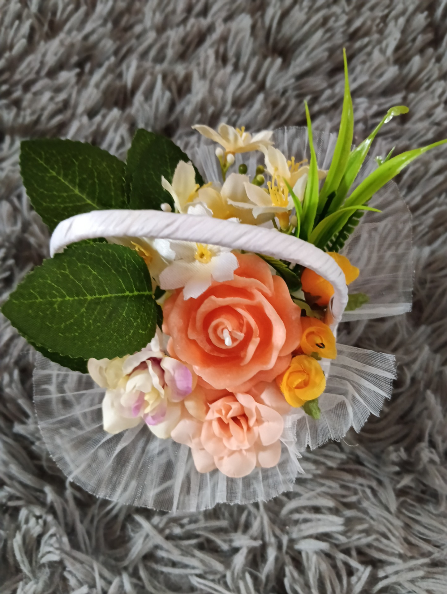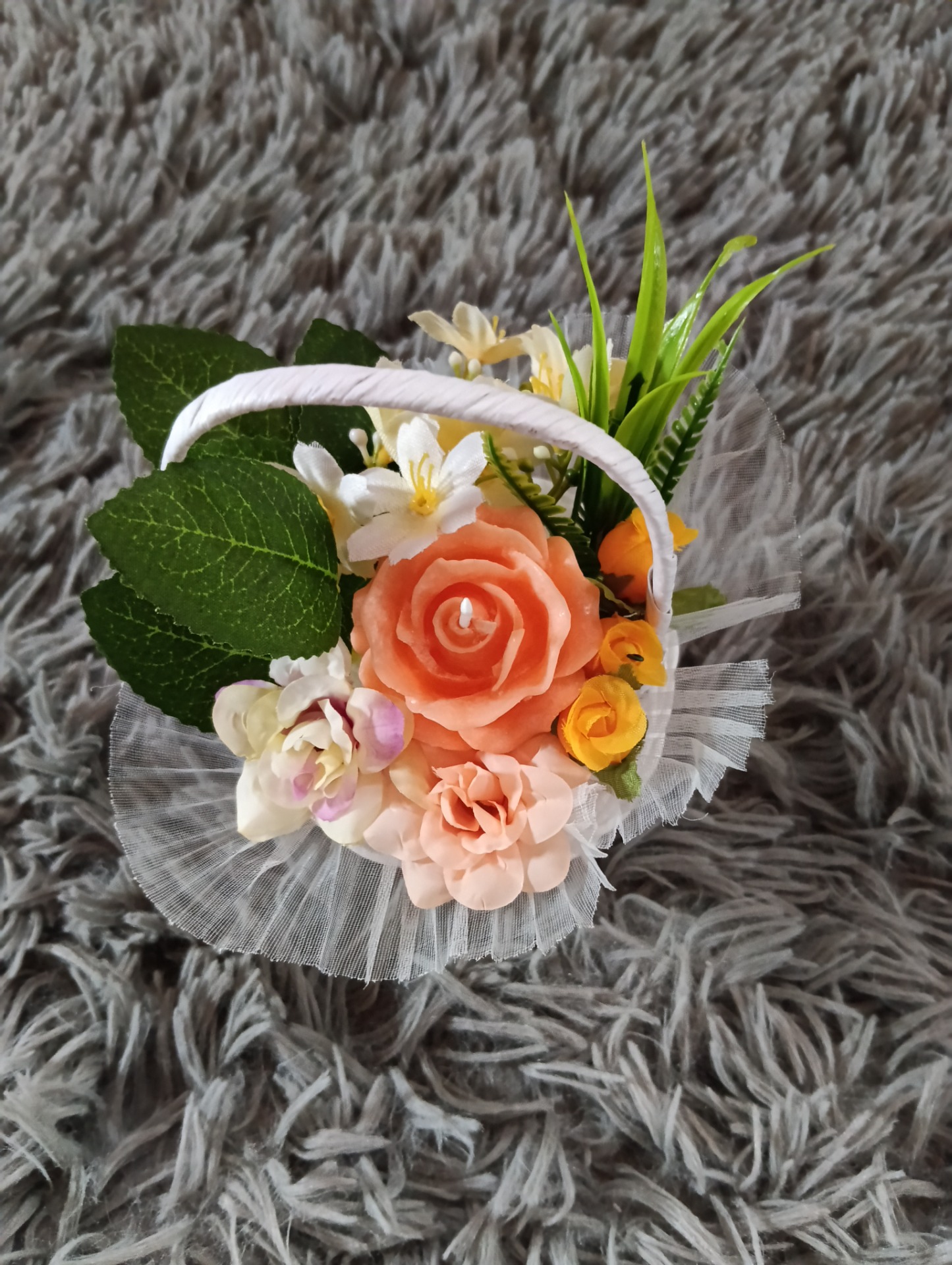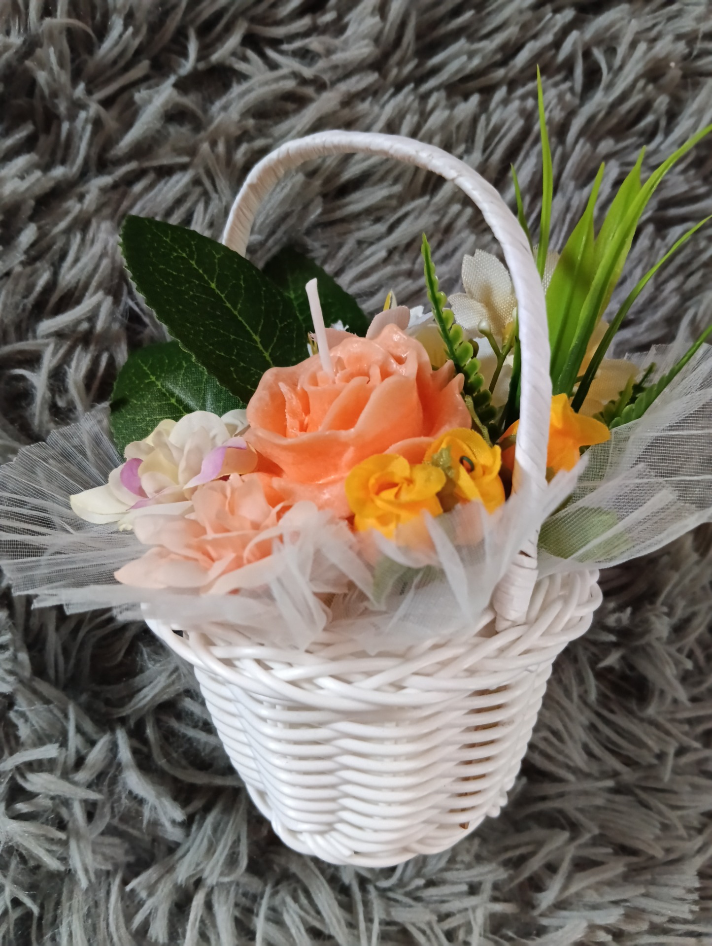 Kytice v košíčku se svíčkou, s květem ze sójového vosku. Doplněná umělými kvítky.
