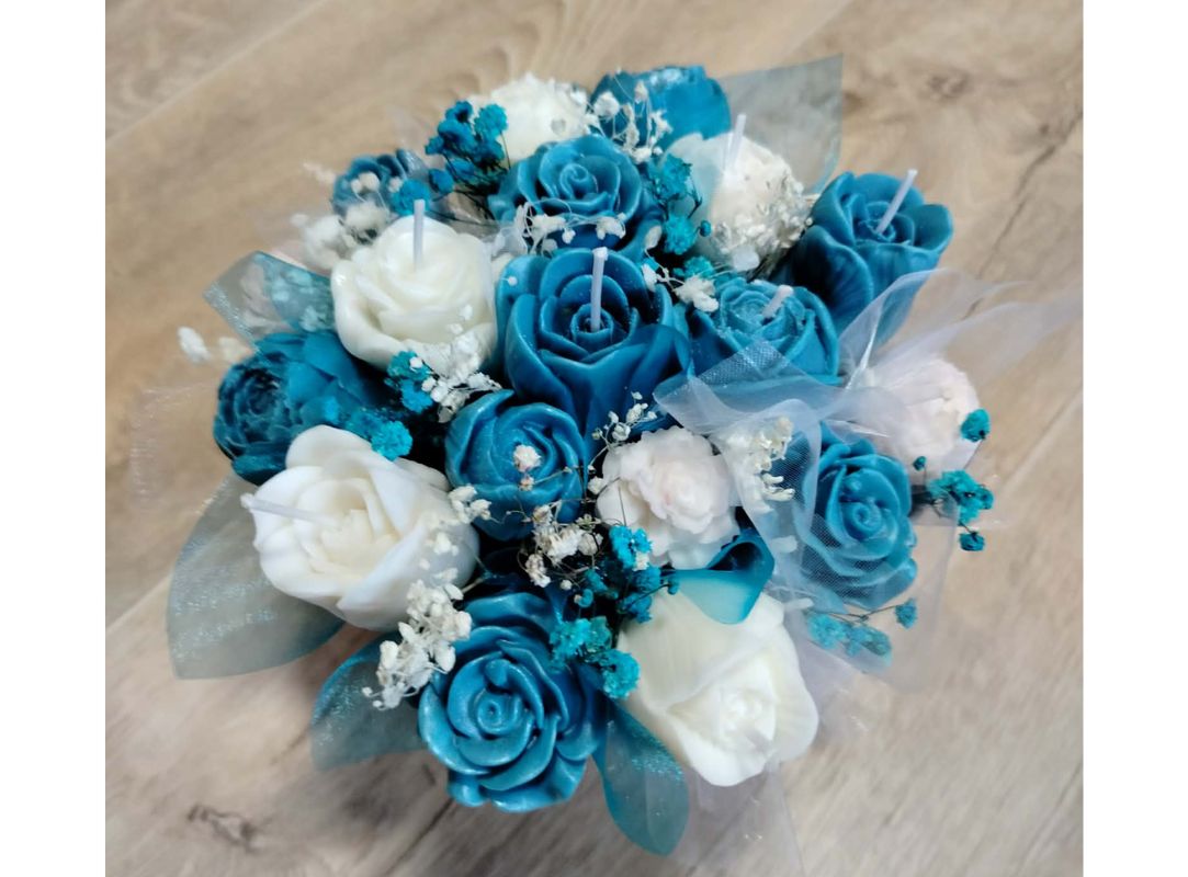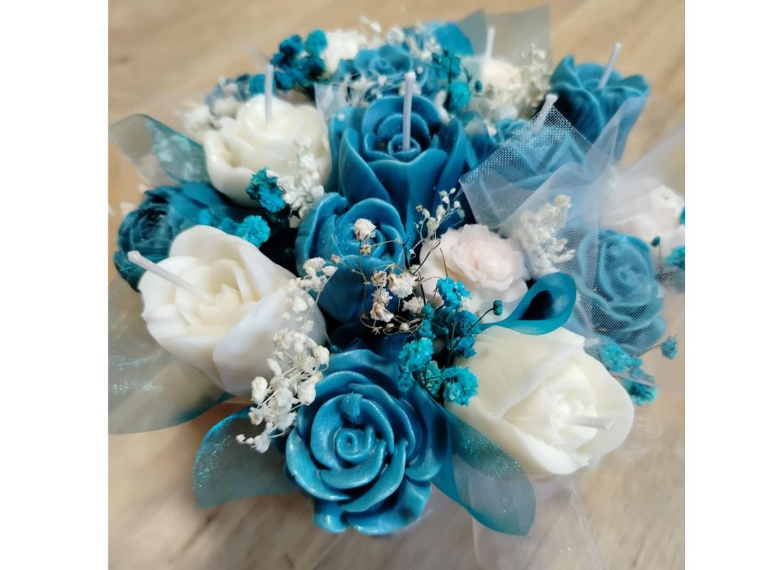 Kytice s květy ze sójového vosku se svíčkami. Doplněná přírodními kvítky.
