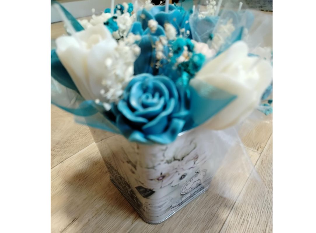Upozornění: Pokud se rozhodnete zapálit květ s knotem, vždy jej nejprve vyjměte z kytice, položte na nehořlavou podložku (talířek, tácek...) a pak teprve je možné svíčku zapálit. Okolní materiál je hořlavý. Kytice je určena spíše k dekoraci.