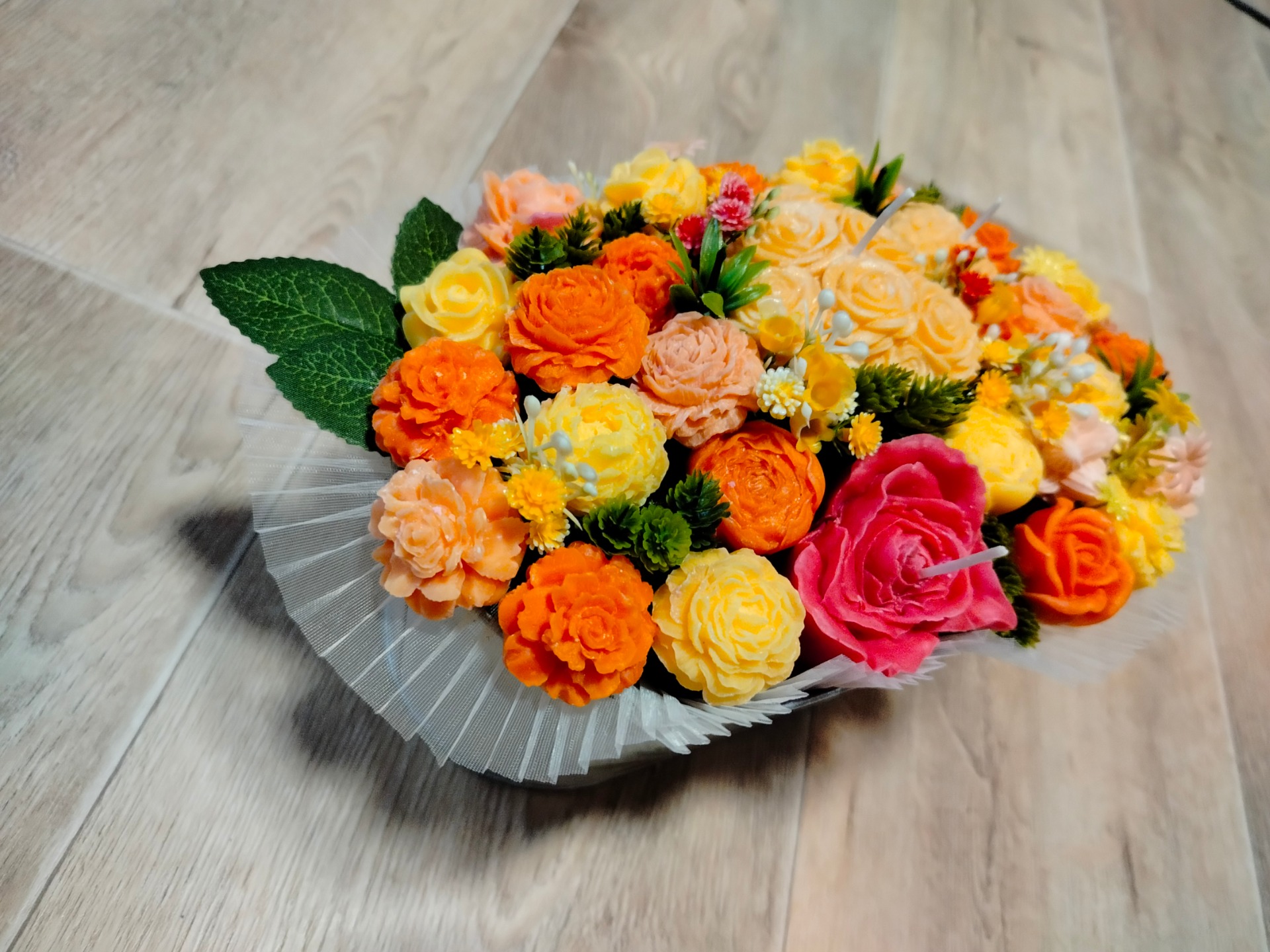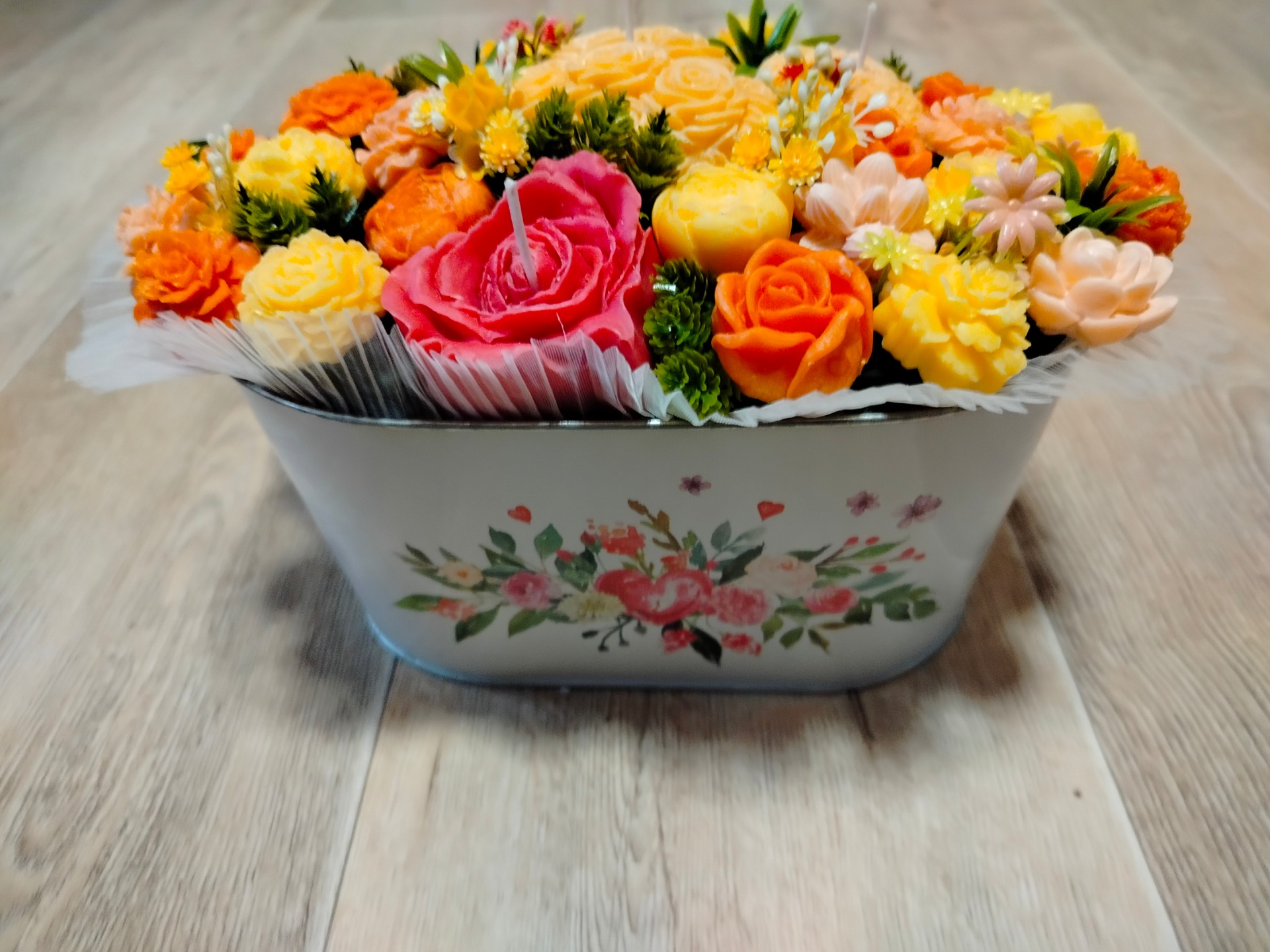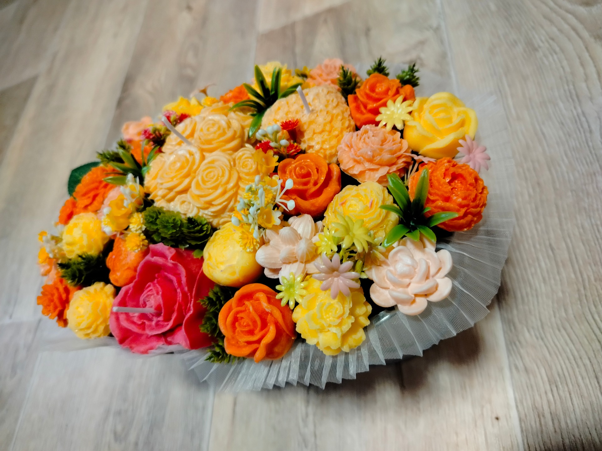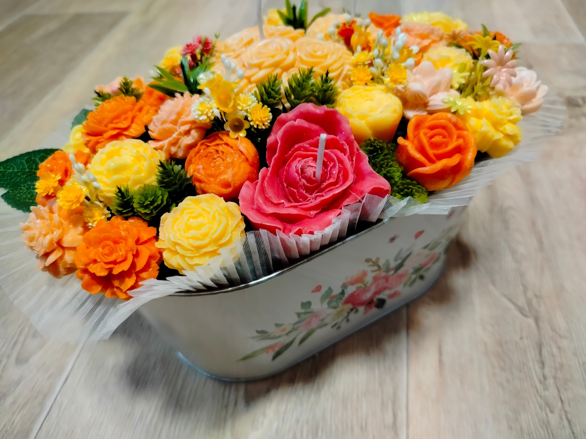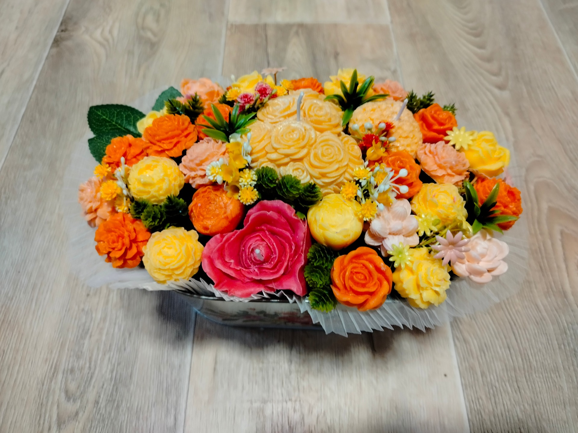 Kytice s květy ze sójového vosku se svíčkami, v kovovem obalu. Doplněná umělými kvítky.