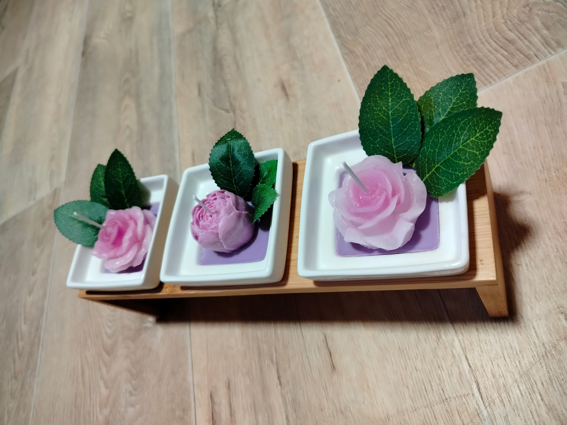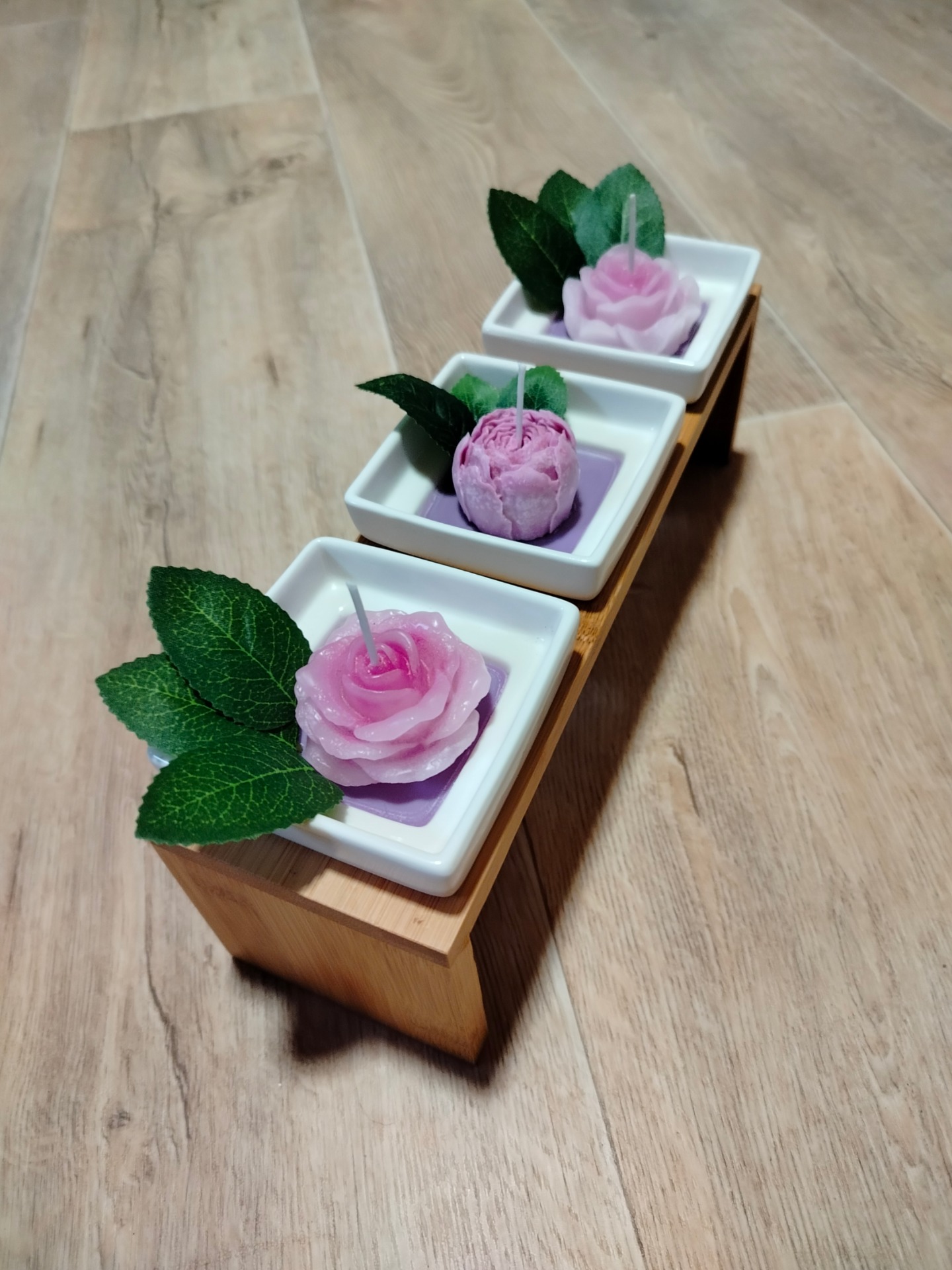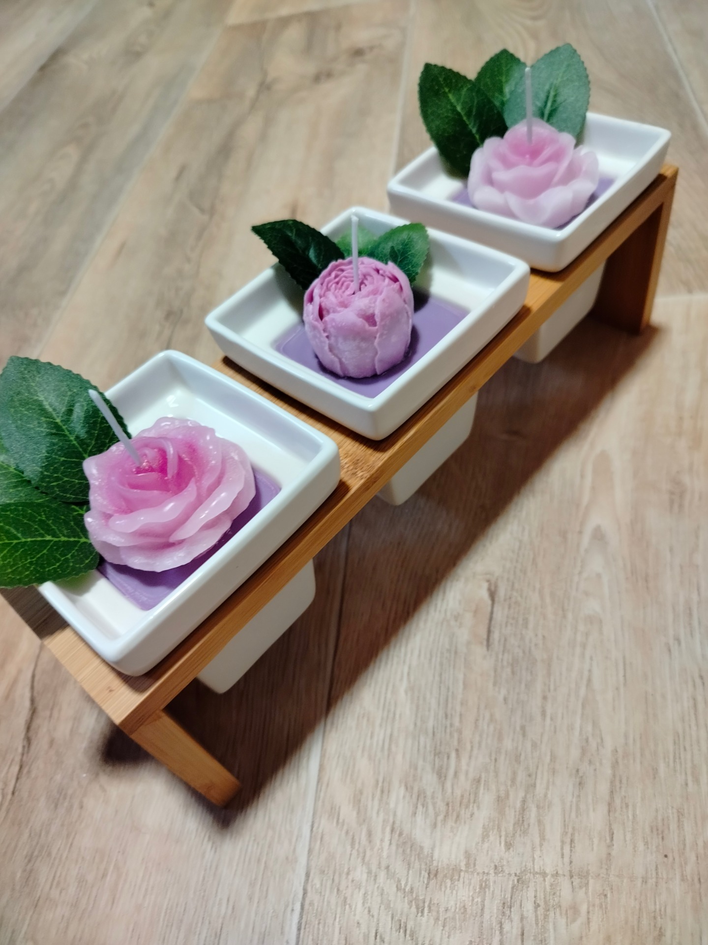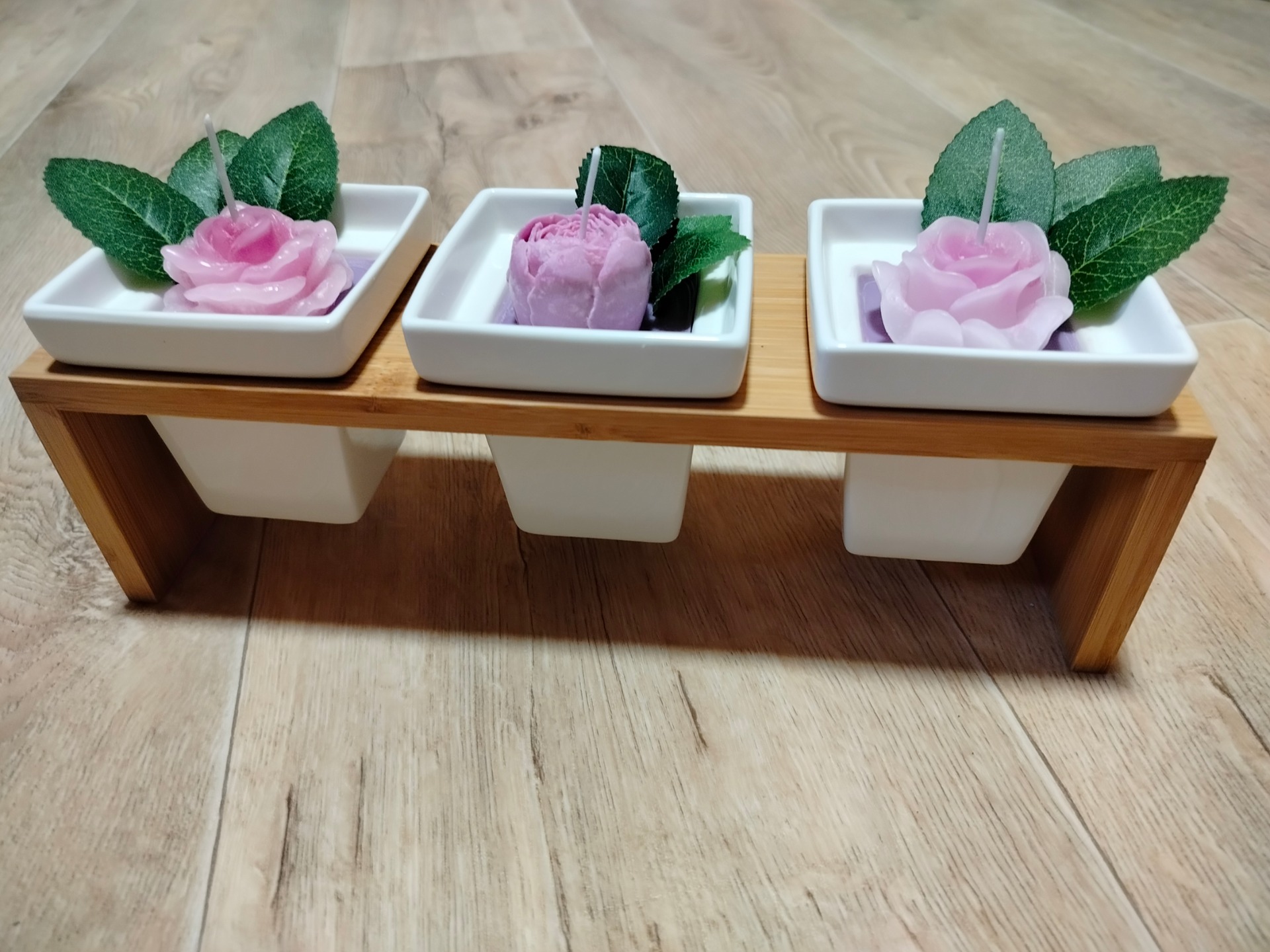 Sada 3 fialovo růžových svíček v bílé keramice a ve dřevěném stojánku. Cena je za celou 1 sadu.