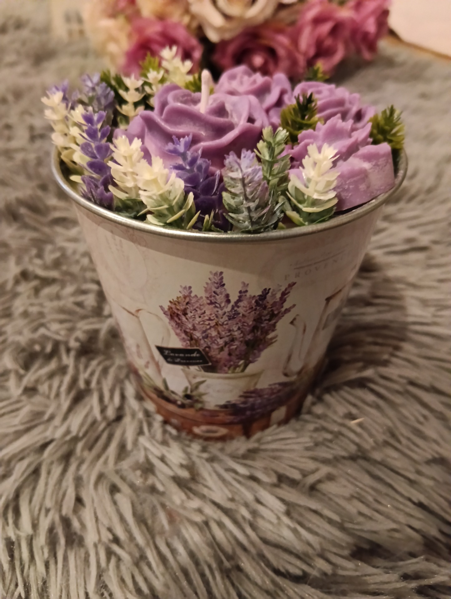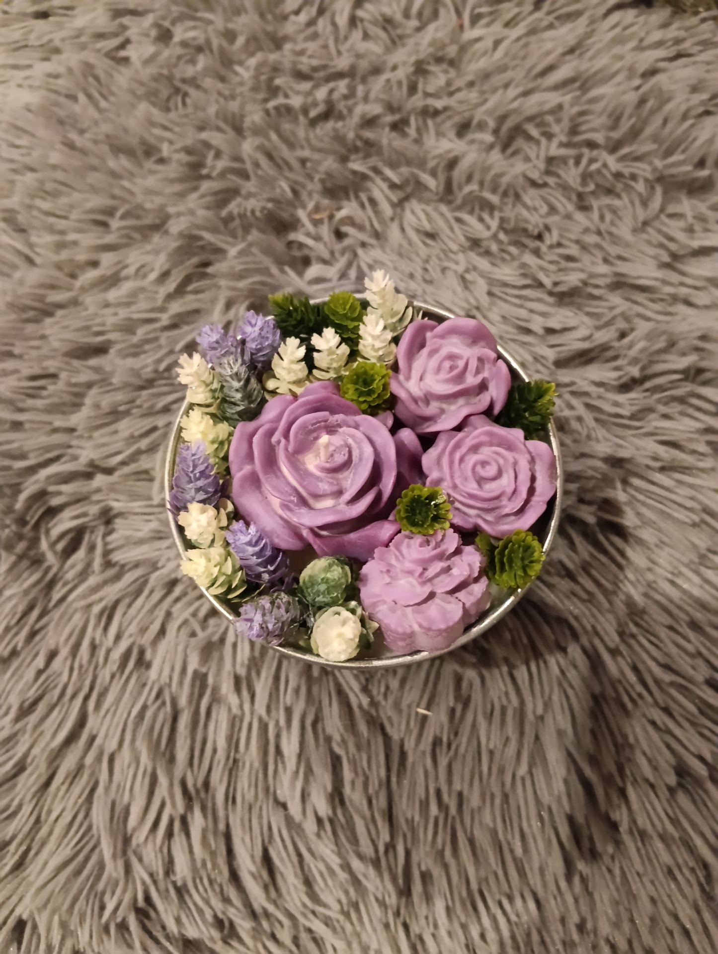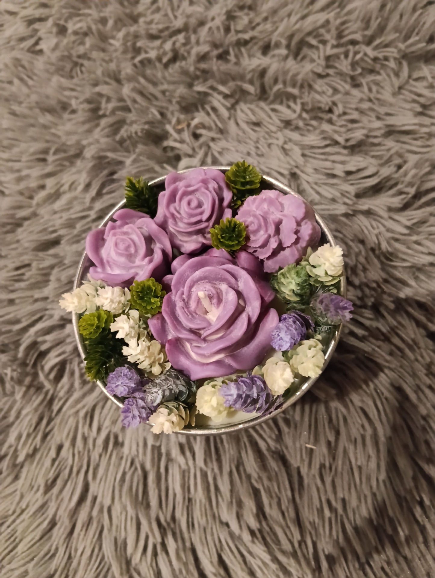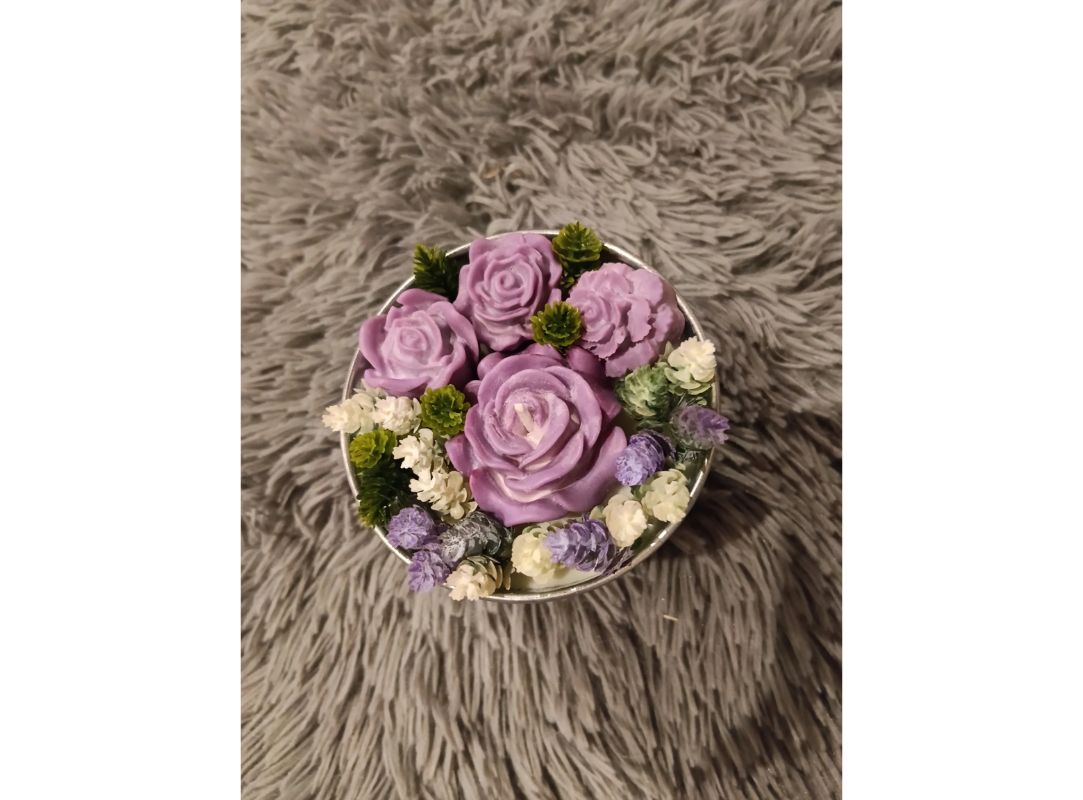 Upozornění: Pokud se svíčku rozhodnete zapálit, vždy nejprve vyjměte okolní dekorace (kvítka, listy) a pak je teprve možné svíčku zapálit. Okolní materiál je hořlavý a je určený pouze k dekoraci.
