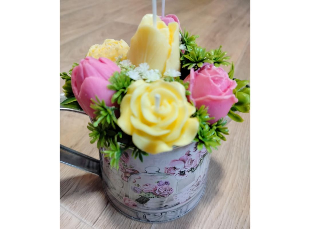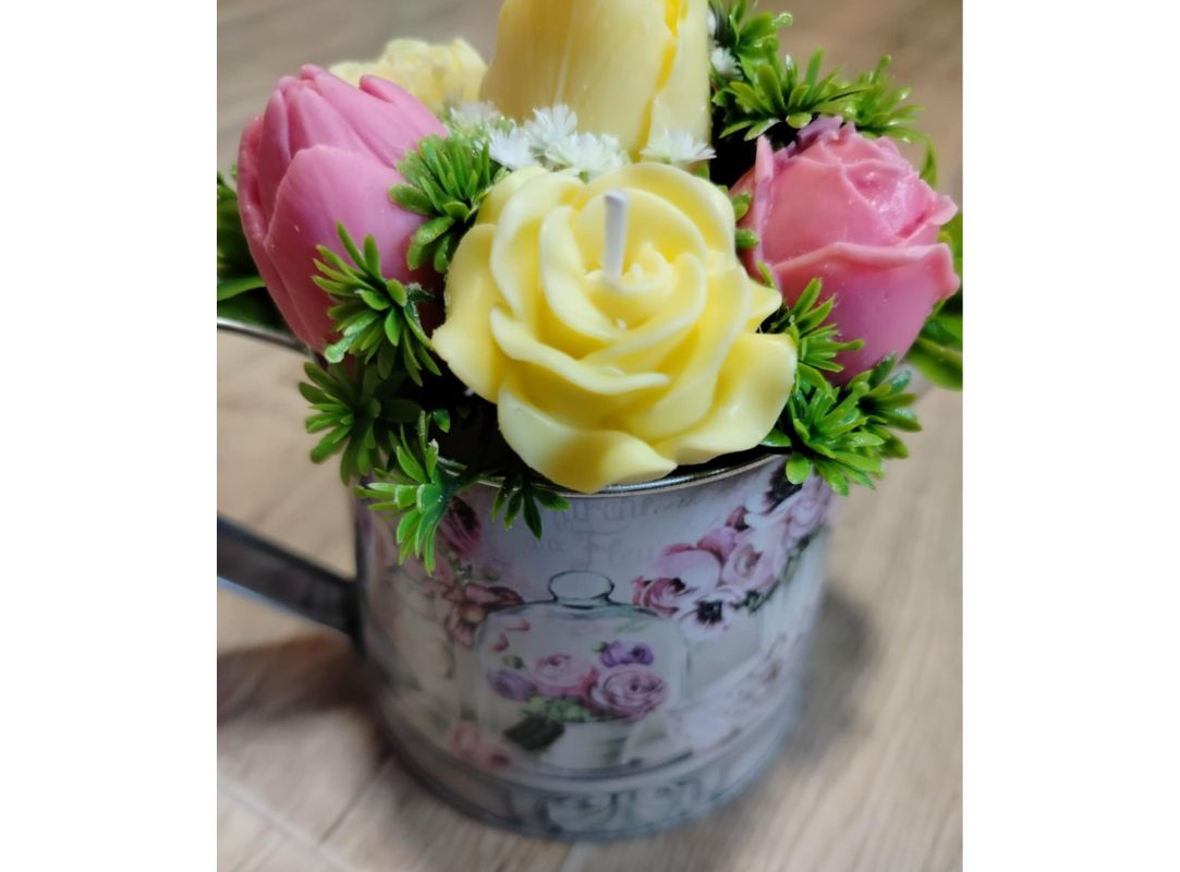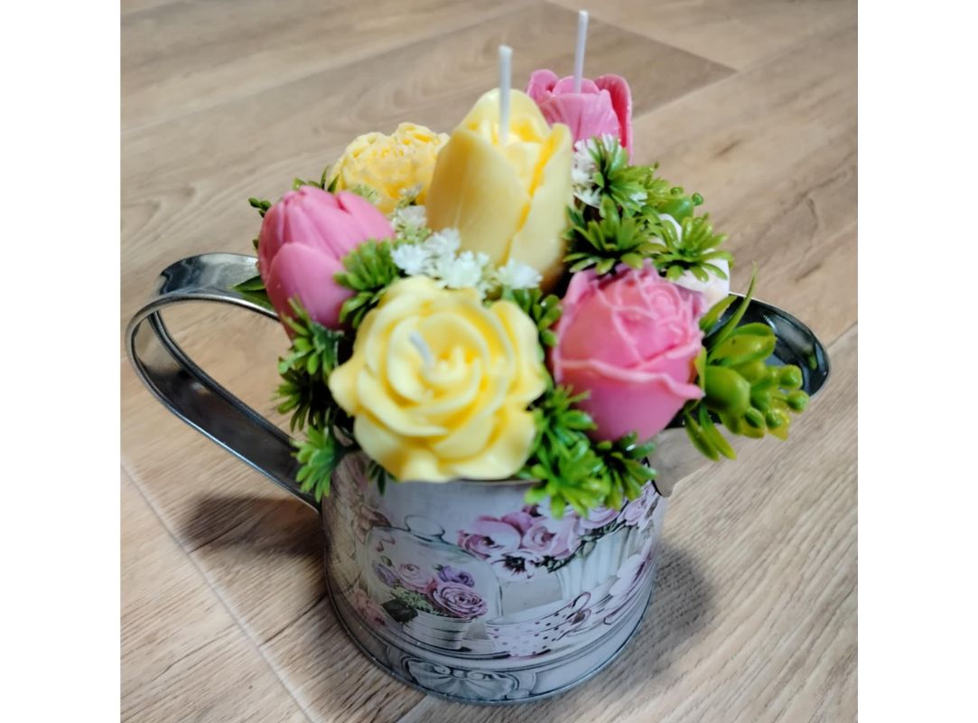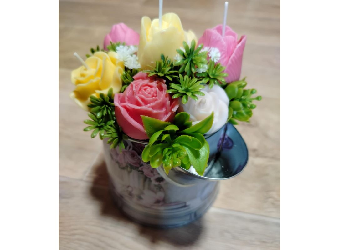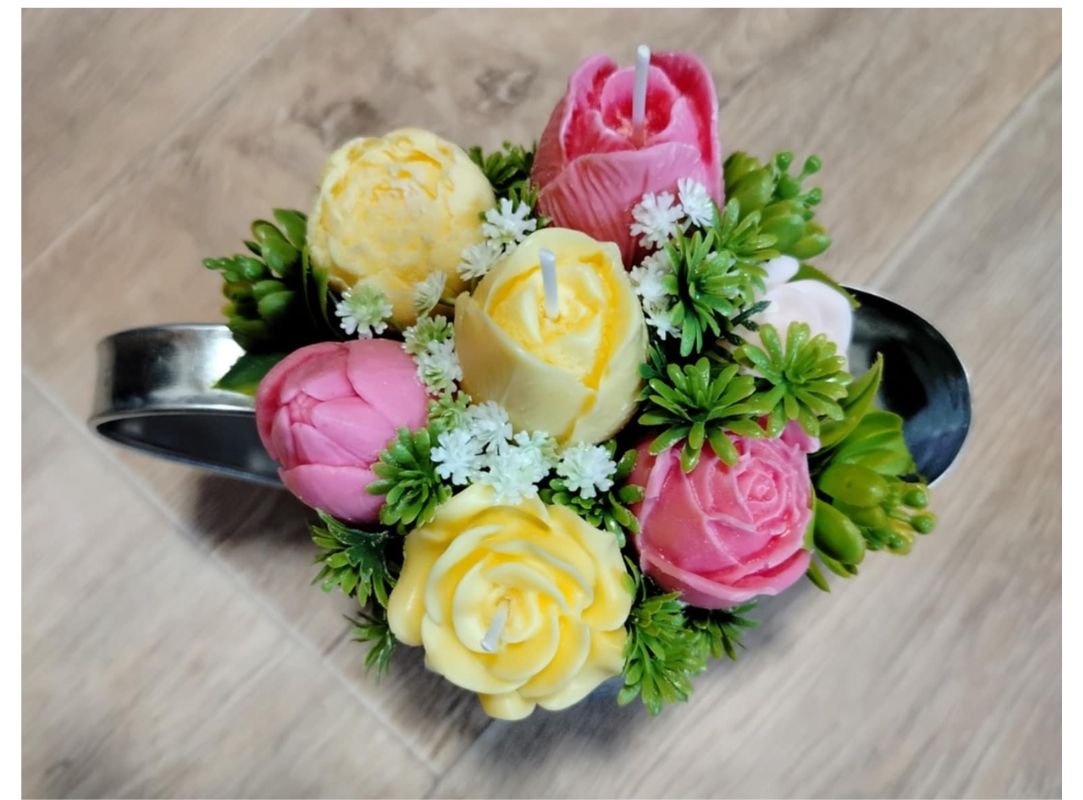 Kytice s květy ze sójového vosku se svíčkami. Doplněná umělými kvítky.